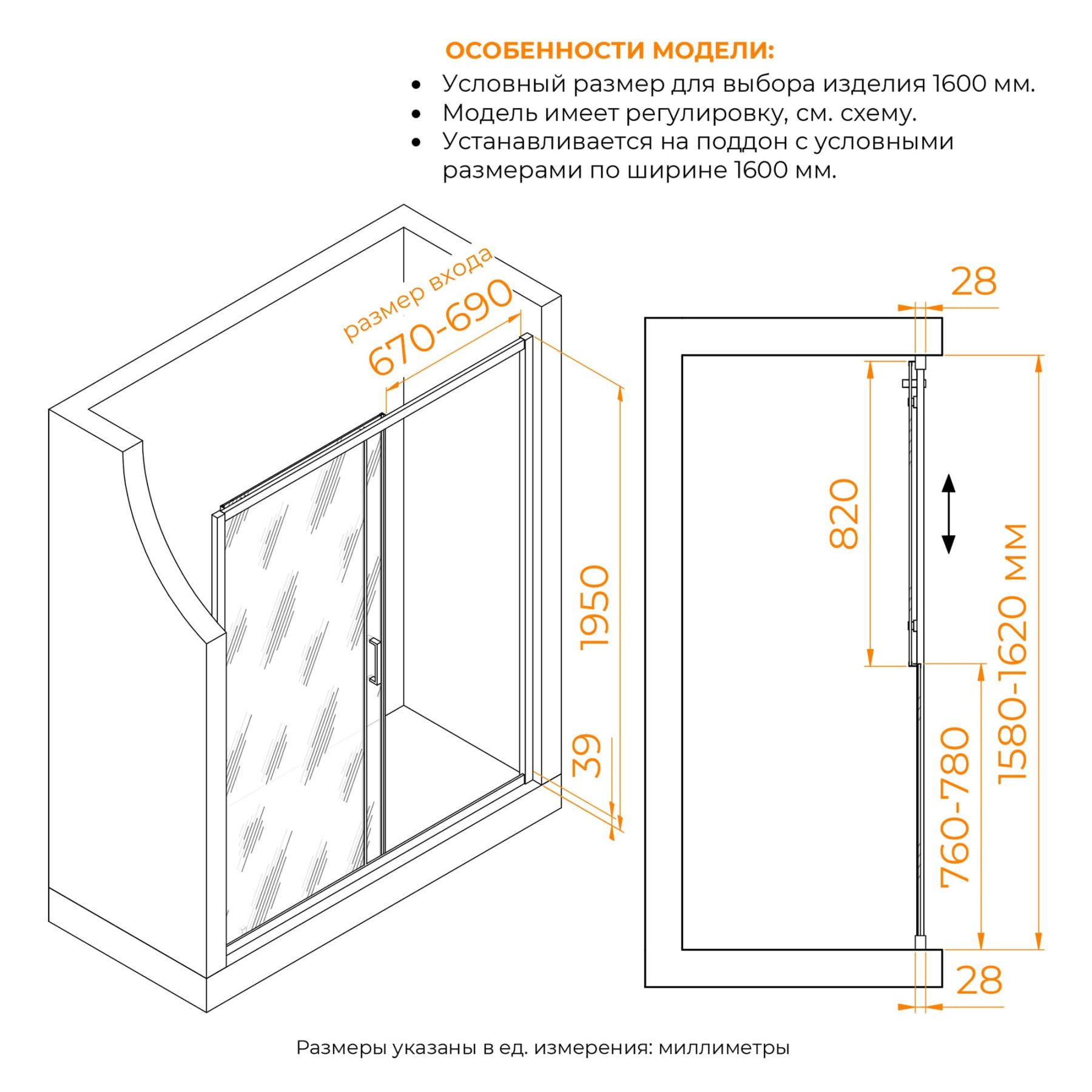- Высота 1950 мм – обеспечивает комфорт и защиту от брызг