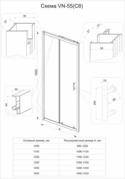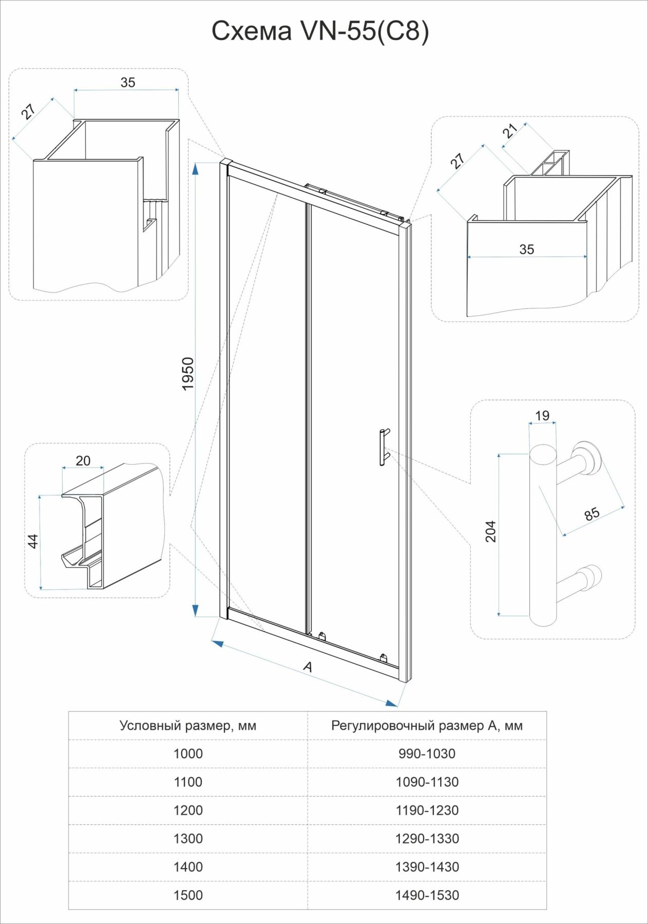 Душевая дверь Veconi Vianno VN-55GM, 1100x1950, Оружейная сталь, стекло прозрачное купить