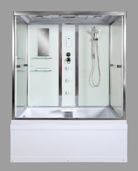 Стильная душевая кабина с внутренней сборкой AvaCan V160 сочетает в себе высокую функциональность, практичность и надежность. Для изготовления применяют безопасное закаленное стекло толщиной 5 мм, надежно фиксируемое алюминиевым профилем. Цвет профиля хром. В комплекте зеркало, сенсорный пульт управления, передний съемный экран, донный клапан (клик-клак), душевой гарнитур, тропический (верхний) душ, откидное сиденье, гидромассажные форсунки, смеситель, переключатель режимов, вентиляция, радио.