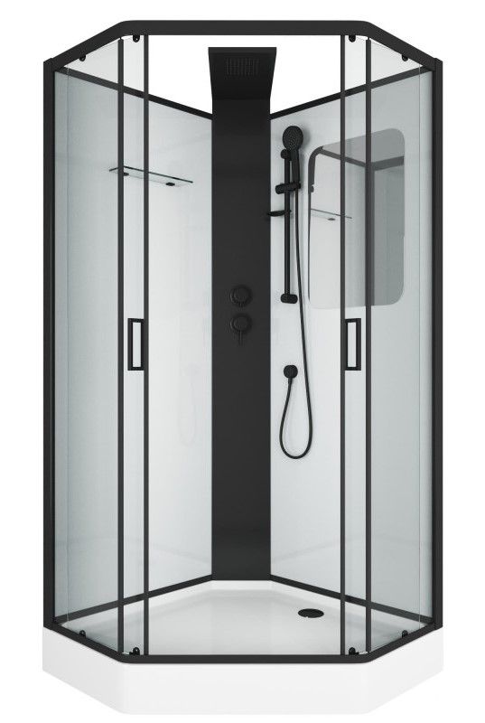 Пятиугольная душевая кабина Grossman GR-250D выглядит лёгкой и невесомой несмотря на довольно просторные габаритные размеры 100 на 100 см. Всё дело в дизайне, в котором белоснежный поддон и задние стенки кабины подчёркнуты строгим чёрным профилем. При этом переднее ограждение полностью прозрачное. Широкая центральная стойка также в матовом чёрном цвете размещена в установочном углу. Визуально облегчает конструкцию и отсутствие крыши. При этом данная модель оборудована верхним тропическим душем. Его лейка является продолжением центральной стойки. Помимо него есть и ручной душ. Его лейку можно установить на удобной высоте при помощи держателя на штанге. Они также выполнены в чёрном цвете.