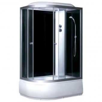 Поддон акриловый высокий 45см(сиденье на поддоне),глубина 28 см,сифон с гофрой,экран съемный, профиль матовый хром, центральная панель серебро, задние стенки закаленные, черные,крашенные,передние стекла закаленные,тонированные, смеситель 2-х режимный,тропический душ,ручной душ, полочка. Разворот кабины(L/R)определяется по прямому углу
