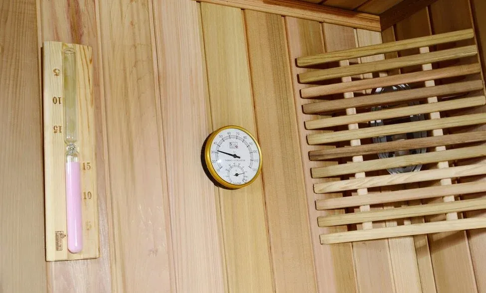 * Финская сауна: печка Harvia, банный камень 20 кг, скамья, гигрометр, песочные часы, абажур, шайка, черпак.