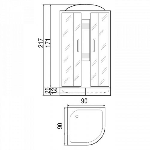 ~ крыша ~ верхний душ ~ вентиляц. отв-я(2шт) ~ центр.стойка ~ держатель д/лейки ~ ручной душ 3-х позиц. ~ полочка-3 шт. ~ смеситель с переключ. режимов ~ поддон п/кр.низ со съемн.экр. (Н=26см) ~ сифон