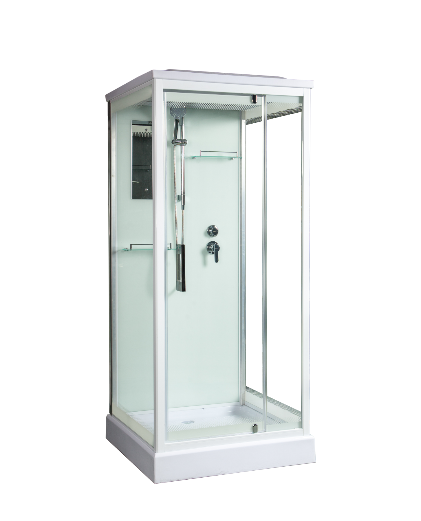 Стекло 6 мм. Задняя стенка - крашеное непрозрачное белое . Фронтальное стекло и боковые стекла прозрачные. Дверь стекло прозрачное.