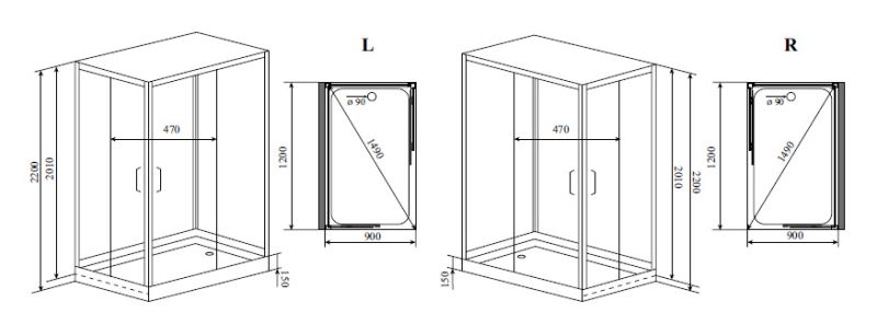 Поддон: акрил с сифоном (диаметр 90mm), армирован стекловолокном, на усиленном каркасе с литым экраном.