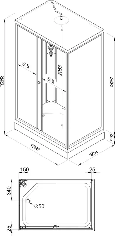 - Верхний душ расположен в крыше кабины