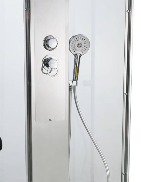 Стильная душевая кабина AvaCan сочетает в себе высокую функциональность, практичность и надежность. При изготовлении применяется безопасное закаленное стекло, надежно фиксируемое алюминиевым профилем. Профиль сделан из алюминия повышенной прочности. Сборка без силикона (увеличивает срок службы, защищает от протечек), внутренняя сборка (облегчает установку и ревизию; позволяет установить в ограниченном пространстве и обойтись без демонтажа других сантехнических приборов), смеситель резьбовой (без хомутов).Двойные металлические ролики дверей (распределение нагрузки на два ролика, увеличивают срок службы). Душевая штанга(позволяет регулировать по высоте ручную лейку), ручная арома-лейка с витамином С (картридж в комплекте,есть возможность замены или удаления картриджа), полочки(из стекла, с ограничителем), сифон с гидрозатвором.