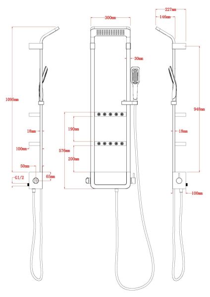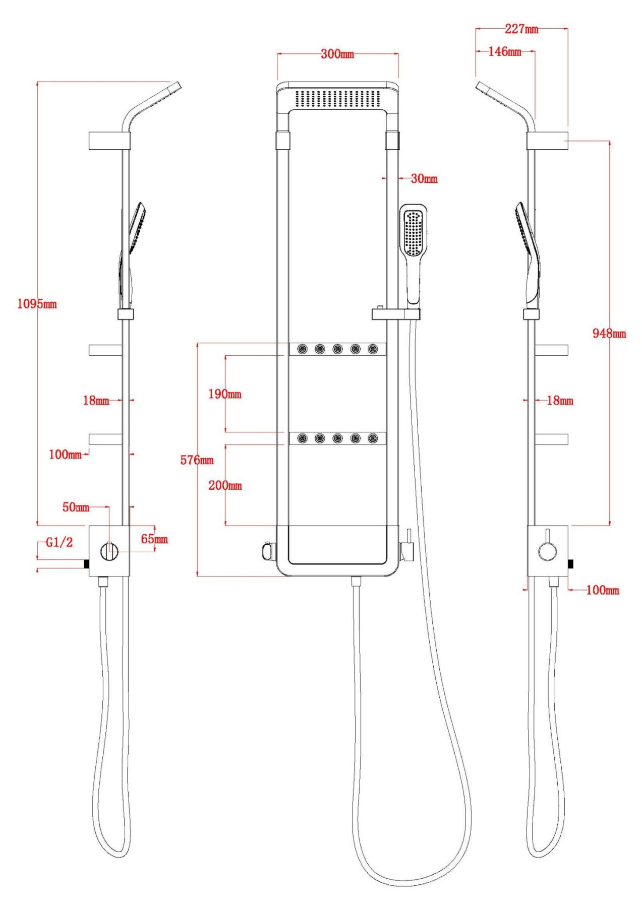 верхний душ, ручной душ и поворотный излив. левый переключатель