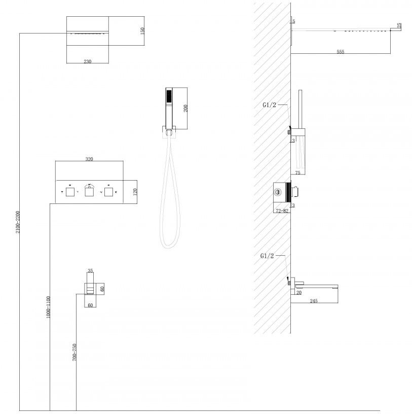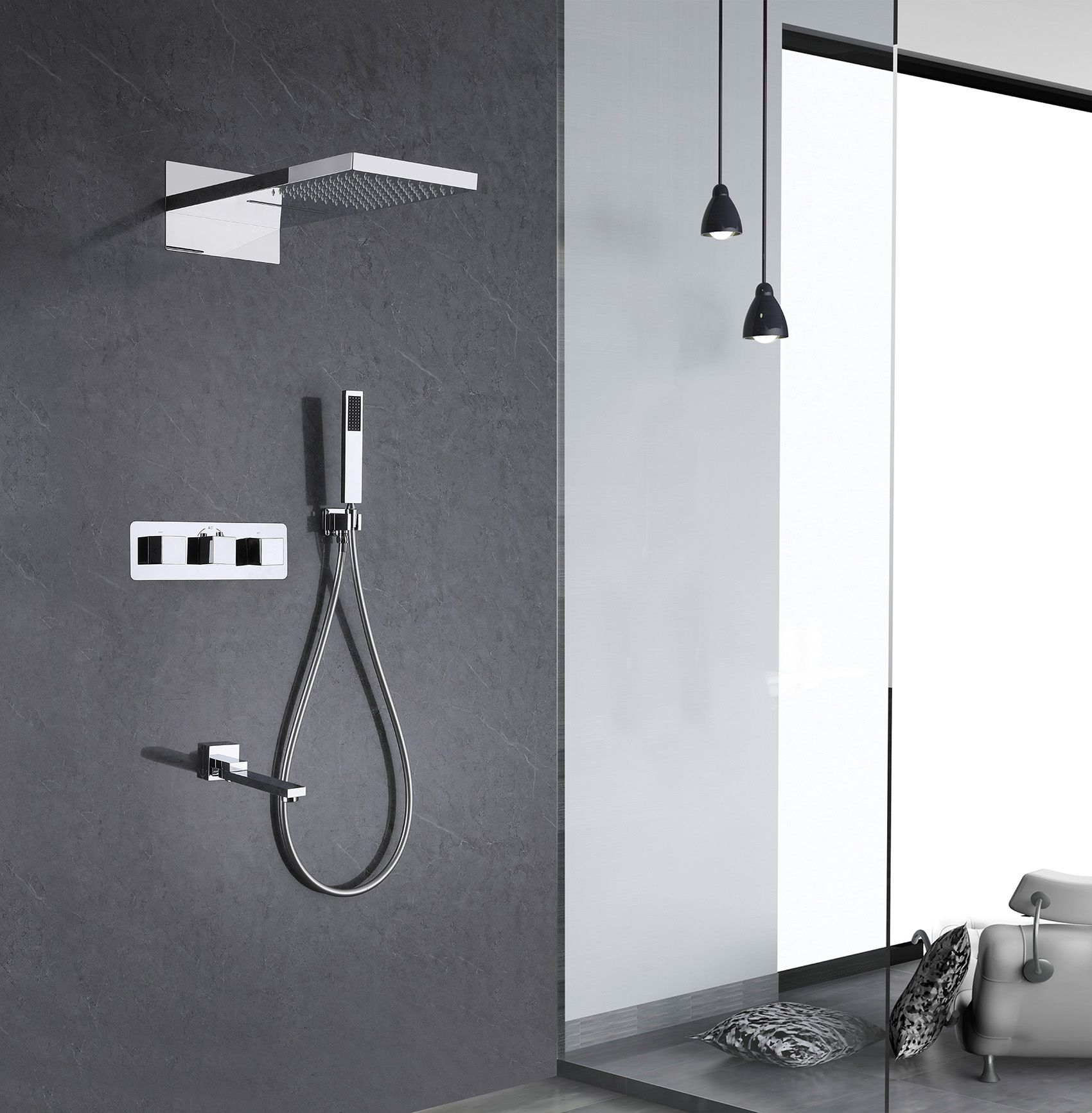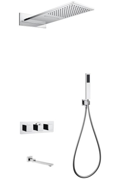 Душевой комплект ABBER отлично дополнит ванную комнату своим незаменимым функционалом. Душевые комплекты ABBER включают в себя все необходимое для создания идеального душевого пространства. Душевой комплект ABBER производится из высококачественных материалов, с отсутствием вредных примесей. Основной цвет исполнения ABBER – хром, идеально подходящий к душевой зоне выполненной в стиле hi-tech. Душевой комплект ABBER правильное решение в оснащении ванной комнаты.Душевая система скрытого монтажа с изливом, термостат, хром