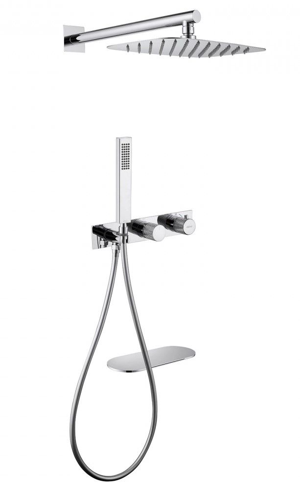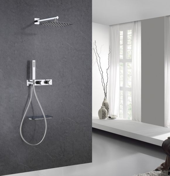 Душевой комплект ABBER отлично дополнит ванную комнату своим незаменимым функционалом. Душевые комплекты ABBER включают в себя все необходимое для создания идеального душевого пространства. Душевой комплект ABBER производится из высококачественных материалов, с отсутствием вредных примесей. Основной цвет исполнения ABBER – хром, идеально подходящий к душевой зоне выполненной в стиле hi-tech. Душевой комплект ABBER правильное решение в оснащении ванной комнаты.Душевая система скрытого монтажа с изливом, термостат, хром