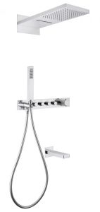 Душевой комплект ABBER отлично дополнит ванную комнату своим незаменимым функционалом. Душевые комплекты ABBER включают в себя все необходимое для создания идеального душевого пространства. Душевой комплект ABBER производится из высококачественных материалов, с отсутствием вредных примесей. Основной цвет исполнения ABBER – хром, идеально подходящий к душевой зоне выполненной в стиле hi-tech. Душевой комплект ABBER правильное решение в оснащении ванной комнаты.Душевая система скрытого монтажа без излива, термостат, хром