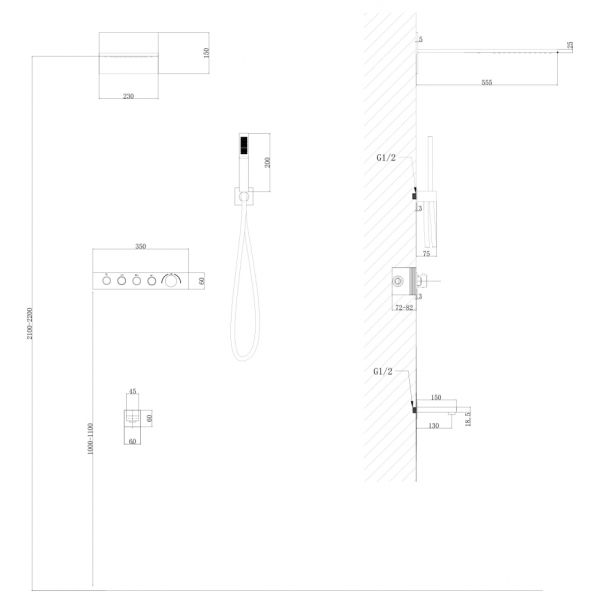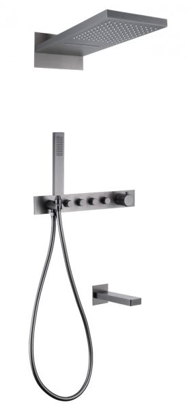 Душевой комплект ABBER отлично дополнит ванную комнату своим незаменимым функционалом. Душевые комплекты ABBER включают в себя все необходимое для создания идеального душевого пространства. Душевой комплект ABBER производится из высококачественных материалов, с отсутствием вредных примесей. Основной цвет исполнения ABBER – хром, идеально подходящий к душевой зоне выполненной в стиле hi-tech. Душевой комплект ABBER правильное решение в оснащении ванной комнаты.Душевая система скрытого монтажа без излива, термостат