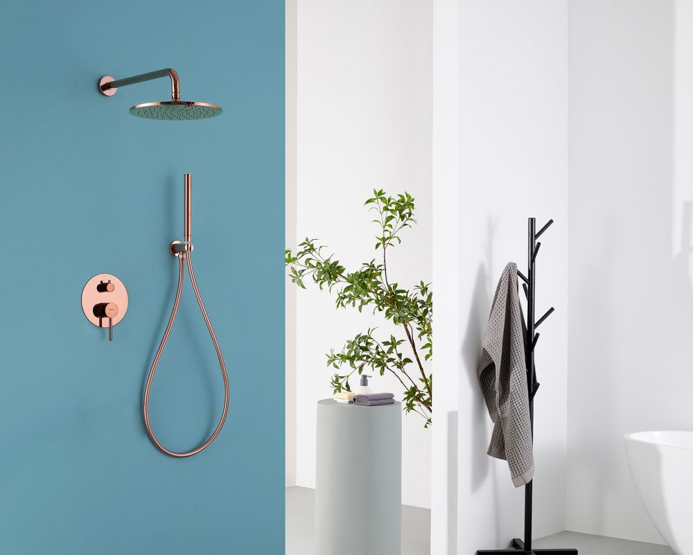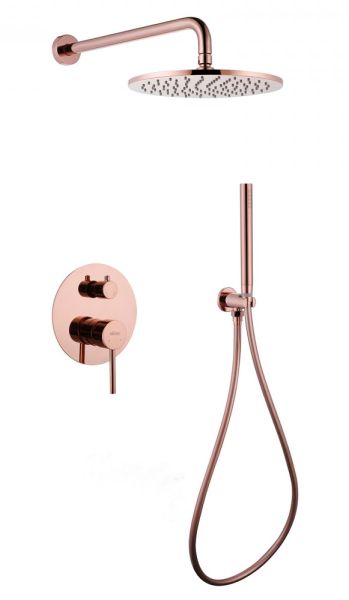 Душевой комплект ABBER роскошно дополнит вашу ванную комнату своим незаменимым функционалом. Душевые комплекты ABBER включают в себя все необходимое для создания идеального душевого пространства. Душевой комплект ABBER производится из высококачественных материалов, с отсутствием вредных примесей. Душевой комплект ABBER правильное решение в оснащении ванной комнаты.Душевая система скрытого монтажа без излива, розовое золото