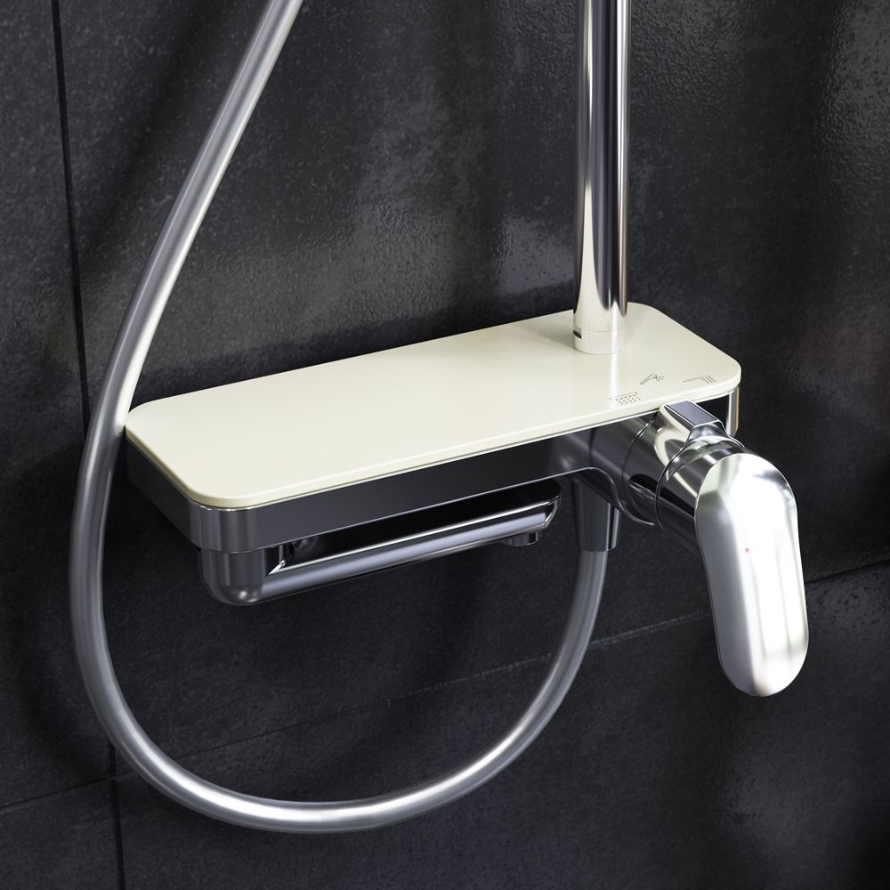 Тотальный дизайн в действии: все детали душевой системы – от пропорций ручного и верхнего душей до рисунка расположения форсунок на лейках.Премиальные размеры и продуманные детали: увеличенный диаметр душевых леек (верхний душ 254 мм и ручной душ 120 мм) позволит ощутить преимущества тропического душа, тогда как увеличенная длина шланга 1750 мм обеспечит свободу движений во время принятия душа. Телескопическая поворотная штанга регулируется по высоте в диапазоне от 1030 до 1460 мм, обеспечивая комфорт для людей любого роста, а шаровой шарнир в держателе верхнего душа позволяет регулировать угол его наклона.Смеситель выполнен в виде полочки. Чистый дизайн без лишних деталей: переключатель расположен за ручкой настройки температуры и позволяет менять источник потока воды от ручной лейки и излива до верхнего душа.