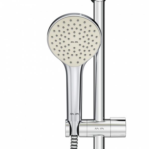 Душевая система Am.Pm Sunny, хром, F0785C800Тотальный дизайн в действии: все детали душевой системы – от пропорций ручного и верхнего душей до рисунка расположения форсунок на лейках – подчинены единой дизайн-концепции коллекции Sunny.Интенсивный напор даже при низком давлении в системе: инновационная функция Air In увеличивает напор вдвое, при этом сокращая расход воды на 30%. Результат – экономия средств, забота об экологии, а главное – непередаваемое удовольствие от принятия душа.Диаметр душевых леек (верхний душ 220 мм и ручной душ 110 мм) позволит ощутить преимущества тропического душа даже в стандартной ванной, тогда как увеличенная длина шланга 1750 мм обеспечит свободу движений во время принятия душа. Продуманные детали для удобства использования: телескопическая поворотная штанга регулируется по высоте в диапазоне от 1030 до 1460 мм, обеспечивая комфорт для людей любого роста.Интенсивный напор даже при низком давлении в системе