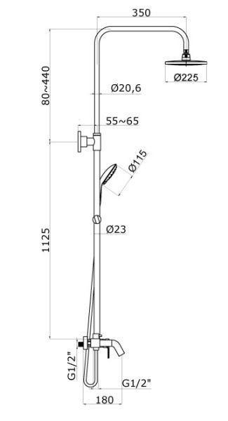 Размер верхнего душа, см:225