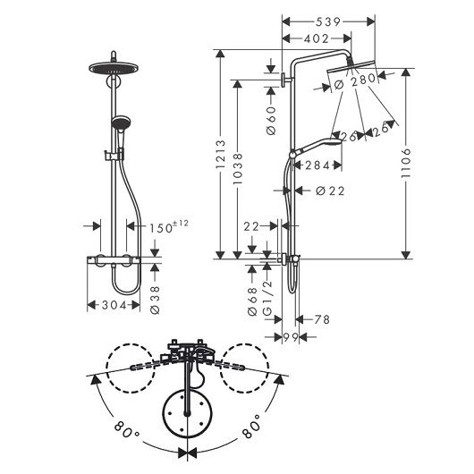 Душевая система Hansgrohe Croma Select S 280 1 режим струи 26890670в комплекте верхний душ, ручной душ, термостат для душа, штанга для душа, держатель для душа, душевая штанга