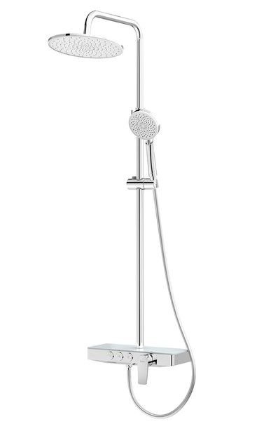 Смеситель для ванны с верхним душем Shelfy – мечты о будущем, доступные уже сегодня. Модель в цвете хром обращает на себя внимание дизайнерским корпусом с декоративными элементами из закаленного стекла и стильными белыми вставками. Одновременно технологичное и невероятно простое управление Push Control позволяет кнопками осуществлять переключение режимов с излива на верхнюю или нижнюю лейку. Регулировка температуры воды до комфортной производится поворотом ручки, оптимальный напор воды – определяется при установке. Любимые косметические средства будет удобно разместить на небольшой полочке на корпусе смесителя.