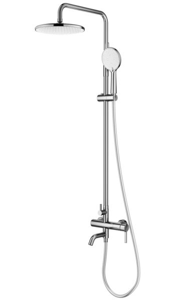 Душевая система Splenka S221.24.05, сатин. Душевая система подходит для ванны и душа. Излив у системы имеет функцию переключения режима подачи воды. Верхний душ имеет круглую форму, из авс-пластика. Верхний душ - ∅250мм. Душевая лейка - 3 режима. Гарантия 5 лет.
