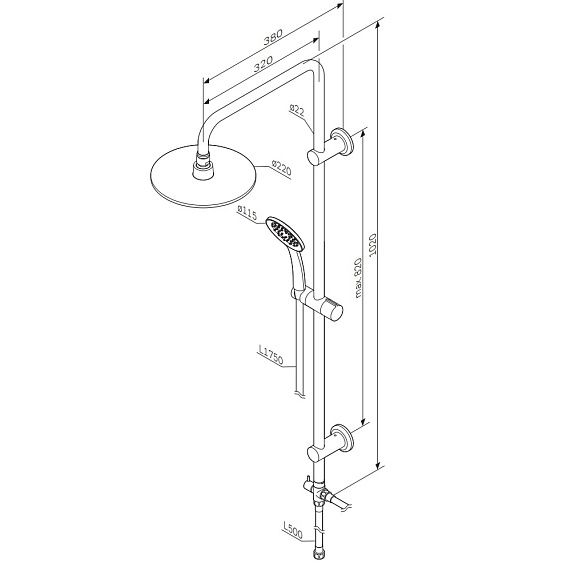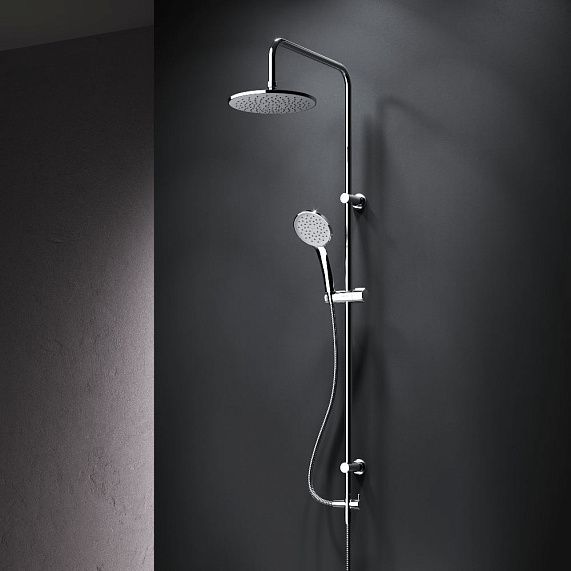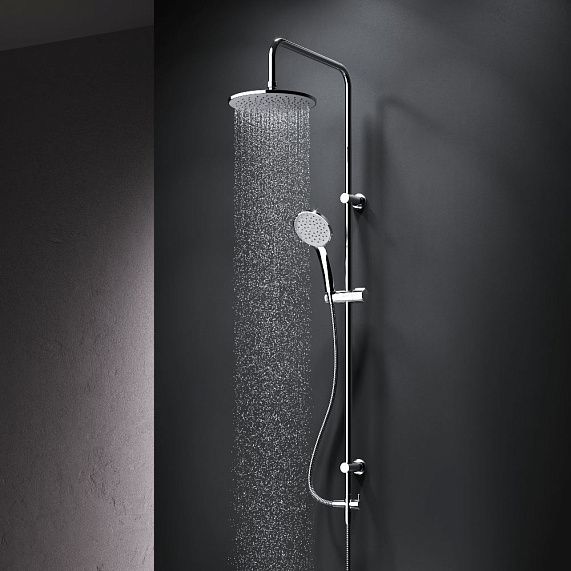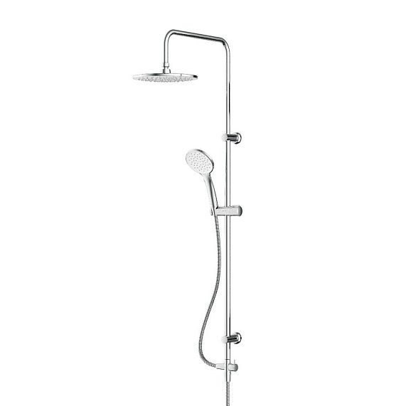 В комплектацию душевой системы входят: тропический душ, ручной душ, держатели штанги и душа. Длина душевой штанги - 1020 мм. Длина душевого шланга - 1750 мм. Размер ручного душа - 115 мм. Диаметр верхнего душа - 220 мм.