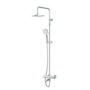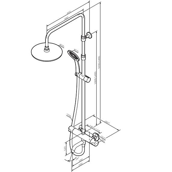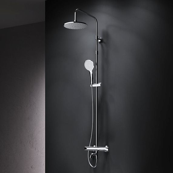 В комплектацию душевой системы входят: тропический душ, ручной душ, смеситель-полочка с термостатом, эксцентрики, держатели штанги и душа. Длина душевой штанги - 1030-1460 мм. Длина душевого шланга - 1750 мм. Размер ручного душа - 130х103 мм. Диаметр верхнего душа - 300х210 мм.