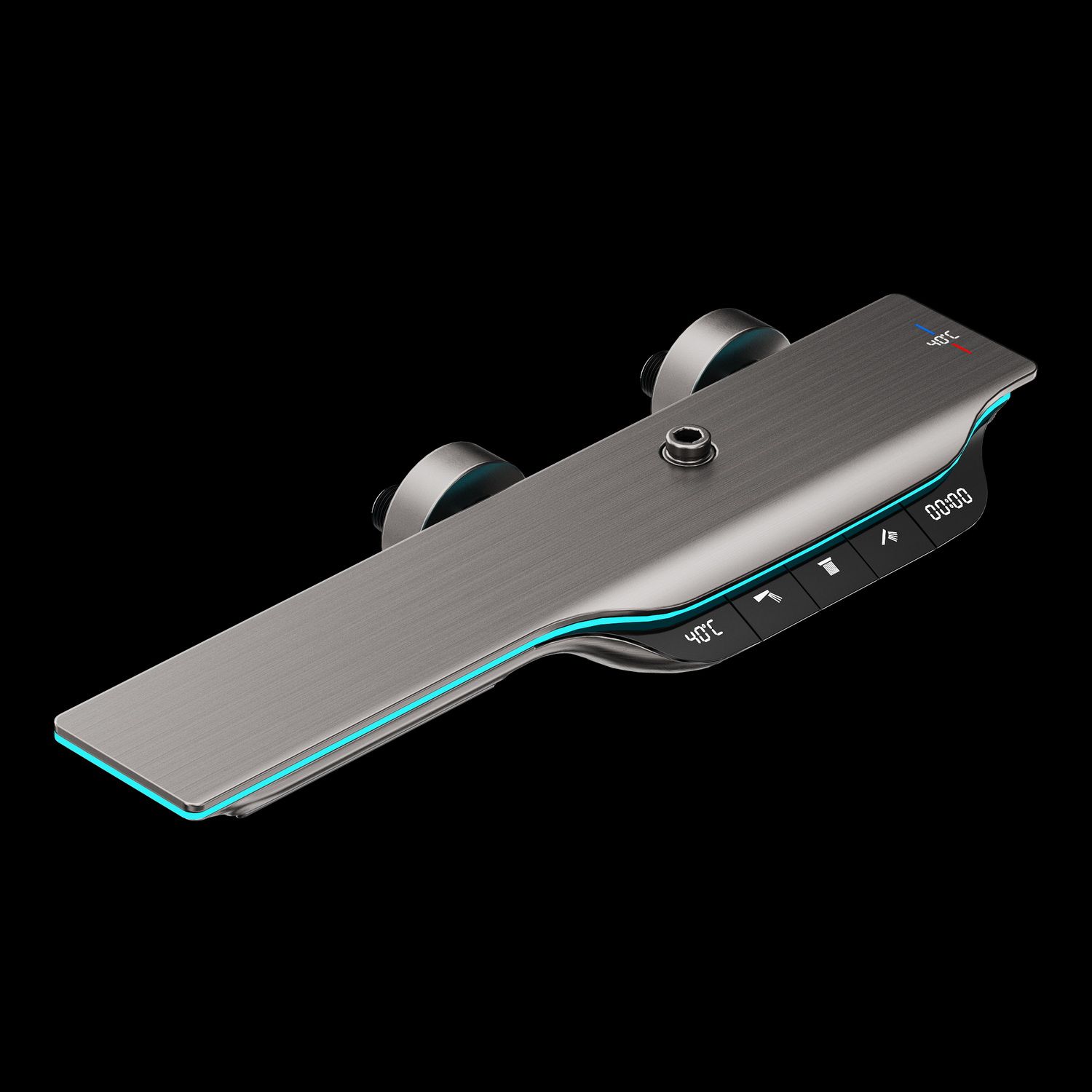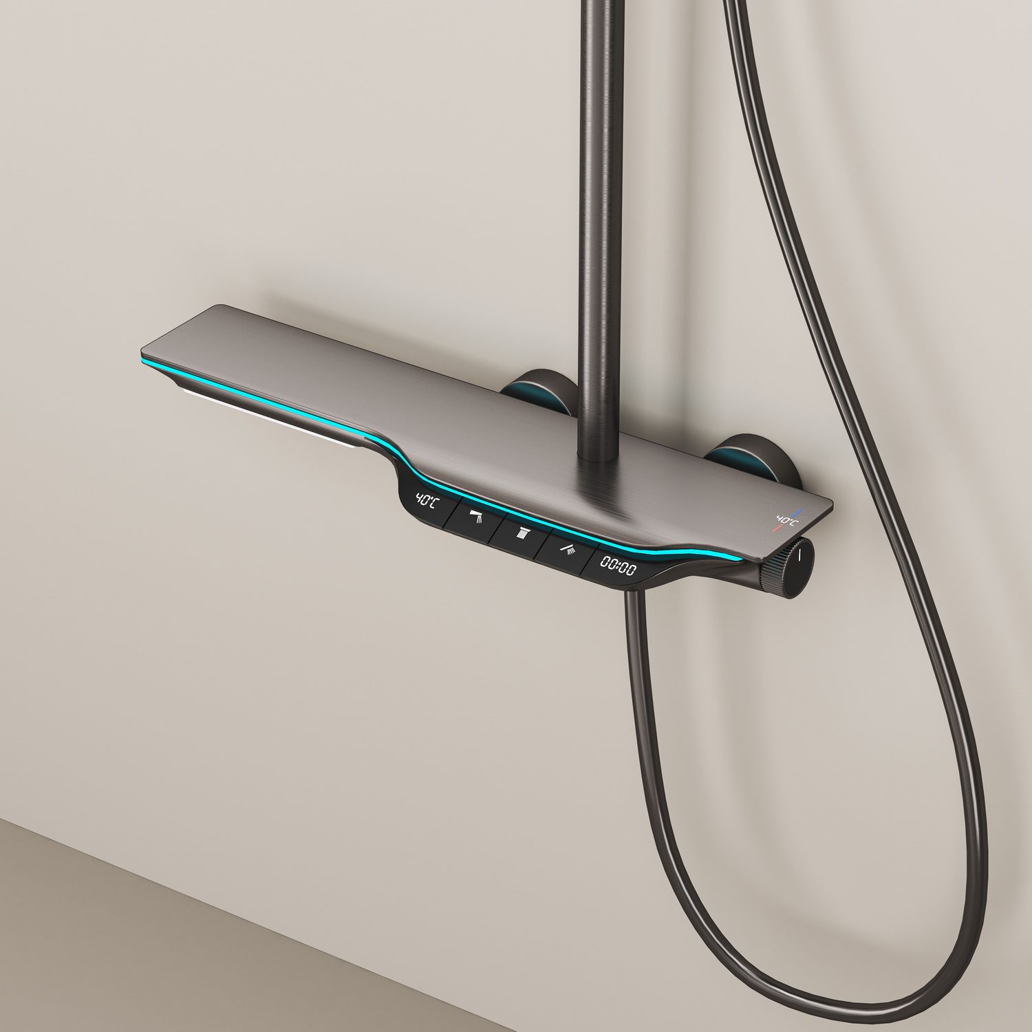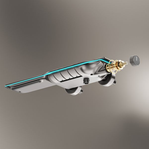 Из потребителей на системе установлен ручной режимный и верхний душ, а также излив скрытой установки и гигиенический душ. Выбор потока осуществляется через клавиши расположенные сверху корпуса смесителя.