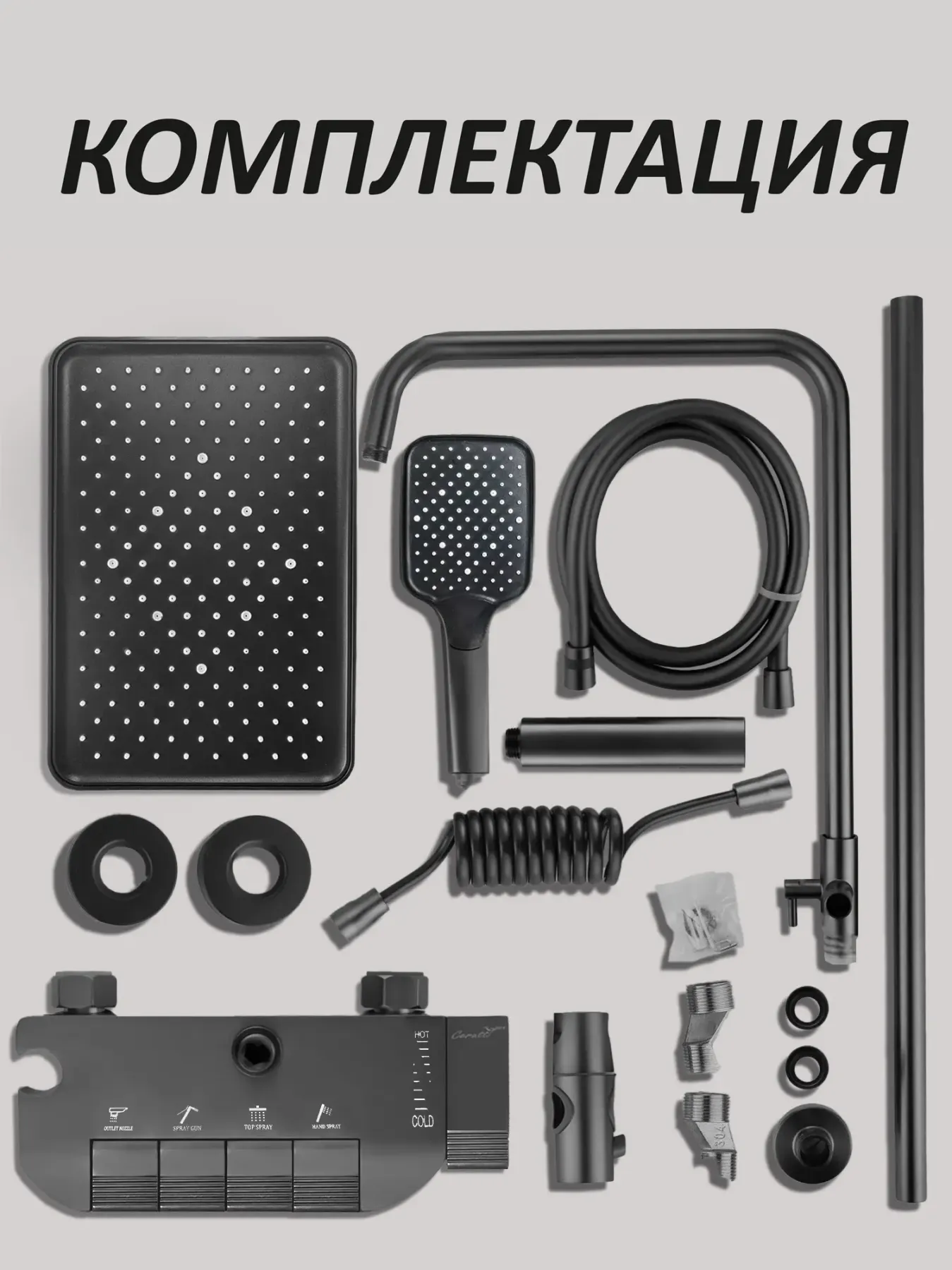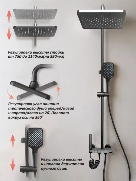 - головной (тропический) душ – выполнен из ABS- пластика, оснащен силиконовыми форсунками для самоочистки системы от налета. Душ имеет увеличенный размер – целых 30см в длину и 20см в глубину. Возможна не только регулировка излива по высоте штангой держателя, но и вращение ее на 90 градусов вправо/влево. Сам излив крепится к ней шарниром, который позволяет вращать душ и отклонять в пределах 20-30 градусов.