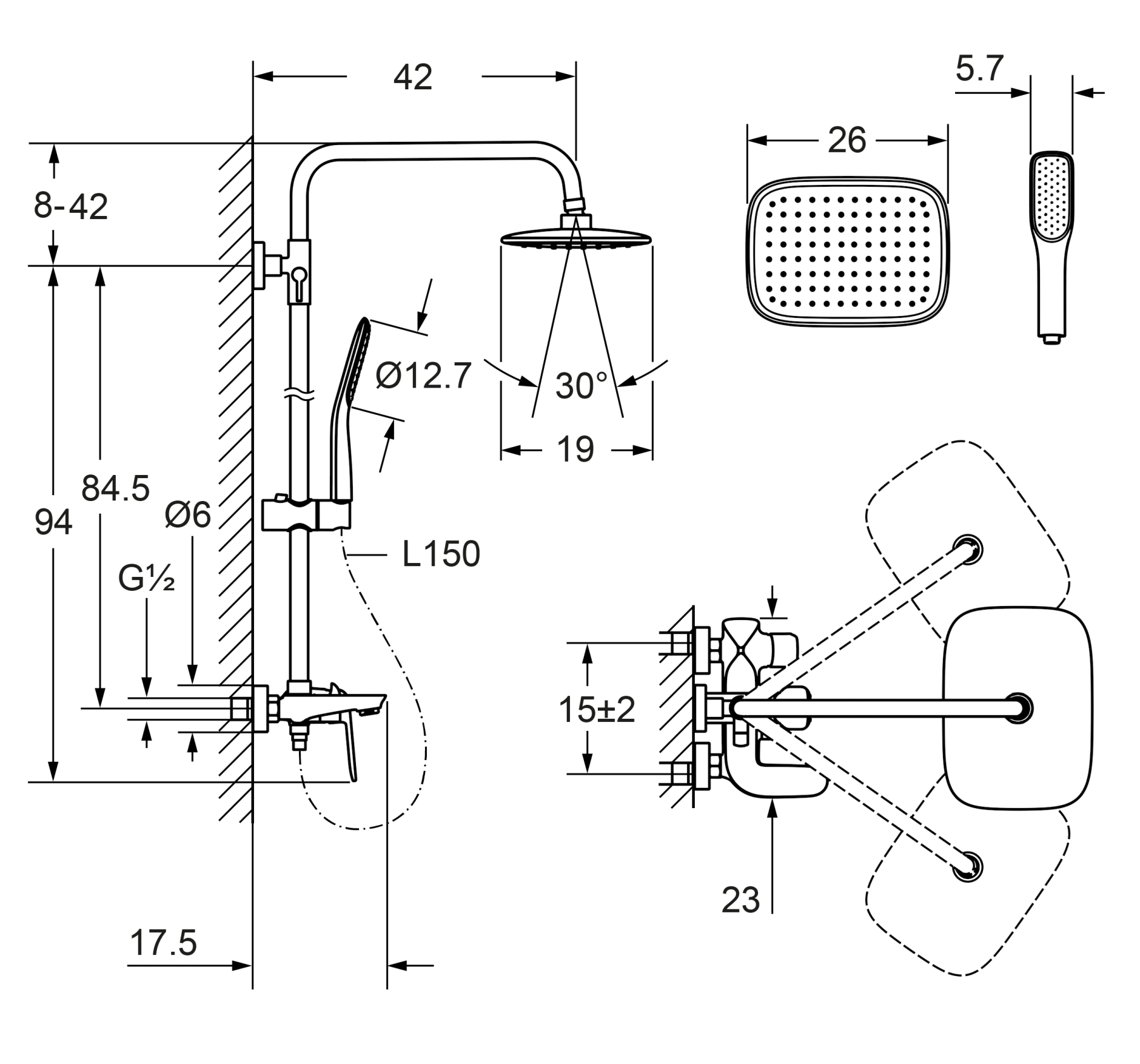 верхний душ, ручной душ, душевой шланг, s-образные эксцентрики, набор прокладок.