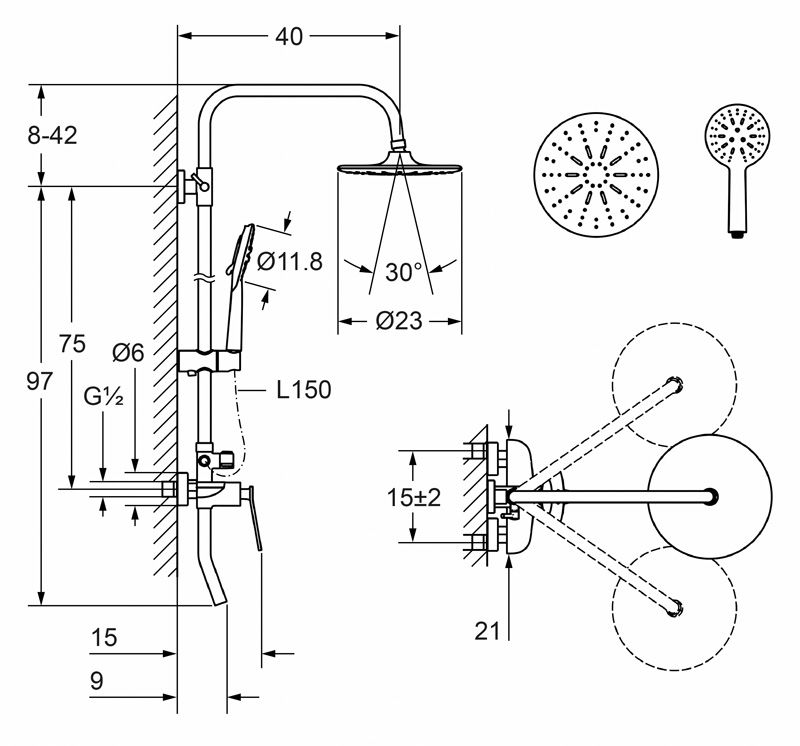 Размер верхнего душа, см:23