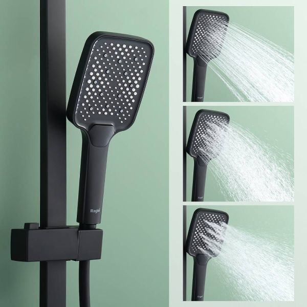Душевая система Raglo R01.24.06Цвет: черный.Материал: латунь.Управление: однорычажное.Механизм: керамический картридж.Излив: поворотный. Аэратор.Регулируемая по высоте душевая штанга: 1026-1566 мм.Форма верхнего душа: прямоугольная.Размер верхнего душа (ШхД): 340х220 мм.Регулируемый по высоте держатель ручного душа.Форма ручного душа: прямоугольная.Количество режимов струи ручного душа: 3.Отверстия для монтажа: 3.Стандарт подводки: G 1/2.Монтаж: на стену.
