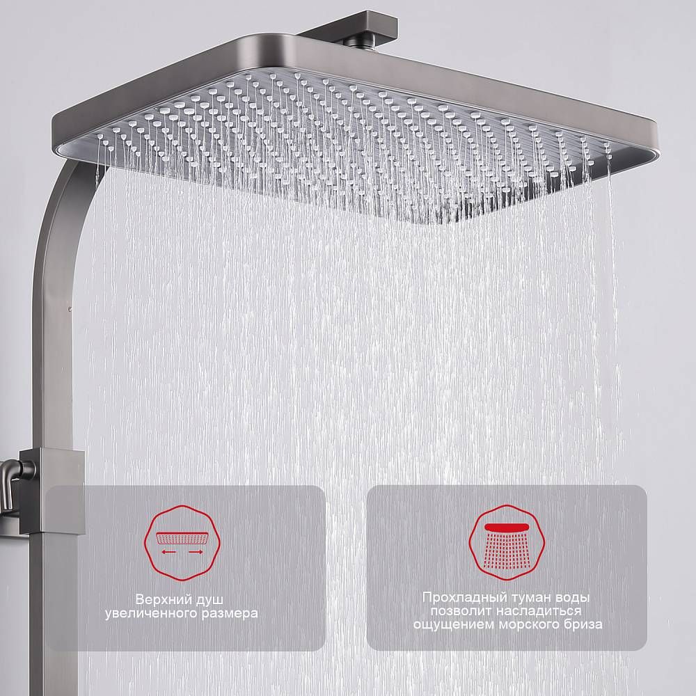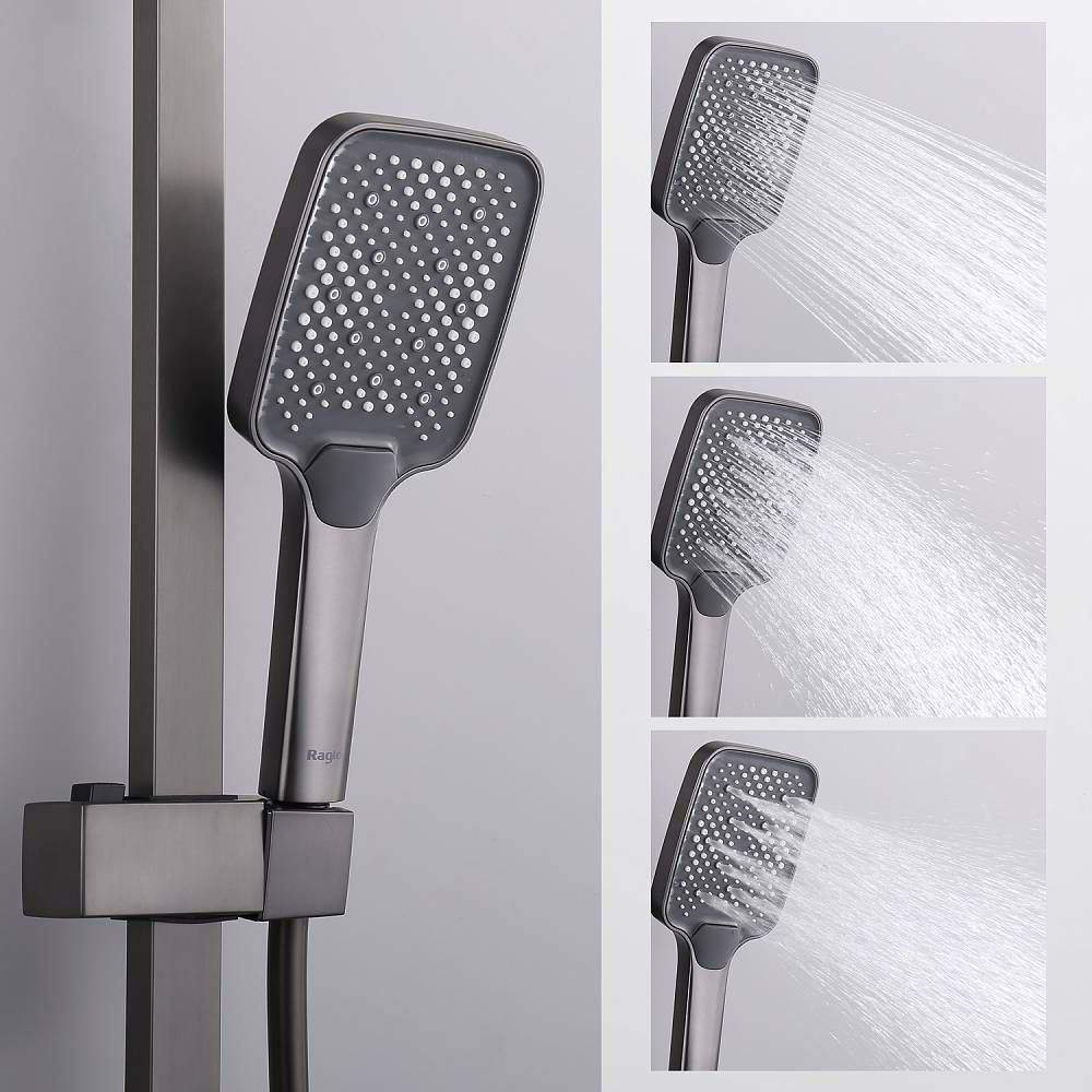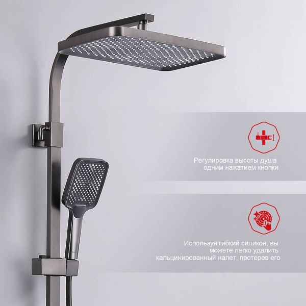 Душевая система Raglo R01.24.09Цвет: графит.Материал: латунь.Управление: однорычажное.Механизм: керамический картридж.Излив: поворотный. Аэратор.Регулируемая по высоте душевая штанга: 1026-1566 мм.Форма верхнего душа: прямоугольная.Размер верхнего душа (ШхД): 340х220 мм.Регулируемый по высоте держатель ручного душа.Форма ручного душа: прямоугольная.Количество режимов струи ручного душа: 3.Отверстия для монтажа: 3.Стандарт подводки: G 1/2.Монтаж: на стену.