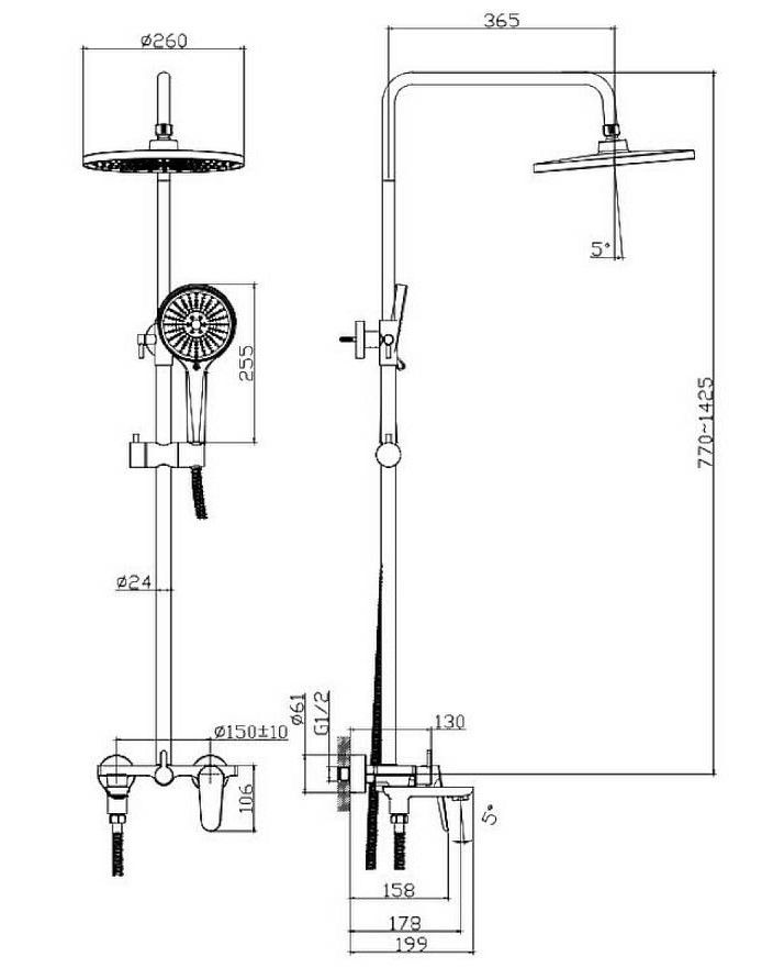 Душевая система Raglo R31.24.09.Материал: латунь.Управление: однорычажное.Механизм: керамический картридж.Излив: поворотный. Аэратор.Регулируемая по высоте душевая штанга: 770-1425 мм.Форма верхнего душа: круглая.Диаметр верхнего душа: 260 мм.Регулируемый по высоте держатель ручного душа.Высота ручного душа: 255 мм.Количество режимов струи ручного душа: 3.Переключение режимов ручного душа: флажковое.Отверстия для монтажа: 3.Стандарт подводки: G 1/2.Монтаж: на стену.