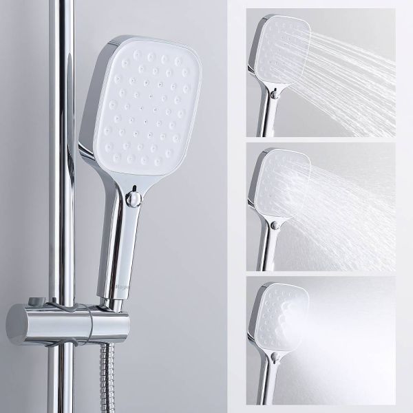 Душевая система Raglo R50.24.Материал: латунь.Управление: однорычажное.Механизм: керамический картридж.Излив: поворотный. Аэратор.Регулируемая по высоте душевая штанга: 1225-1675 мм.Форма верхнего душа: прямоугольная.Размер верхнего душа 312х212 мм.Регулируемый по высоте держатель ручного душа.Количество режимов струи ручного душа: 3.Отверстия для монтажа: 3.Стандарт подводки: G 1/2.Монтаж: на стену.