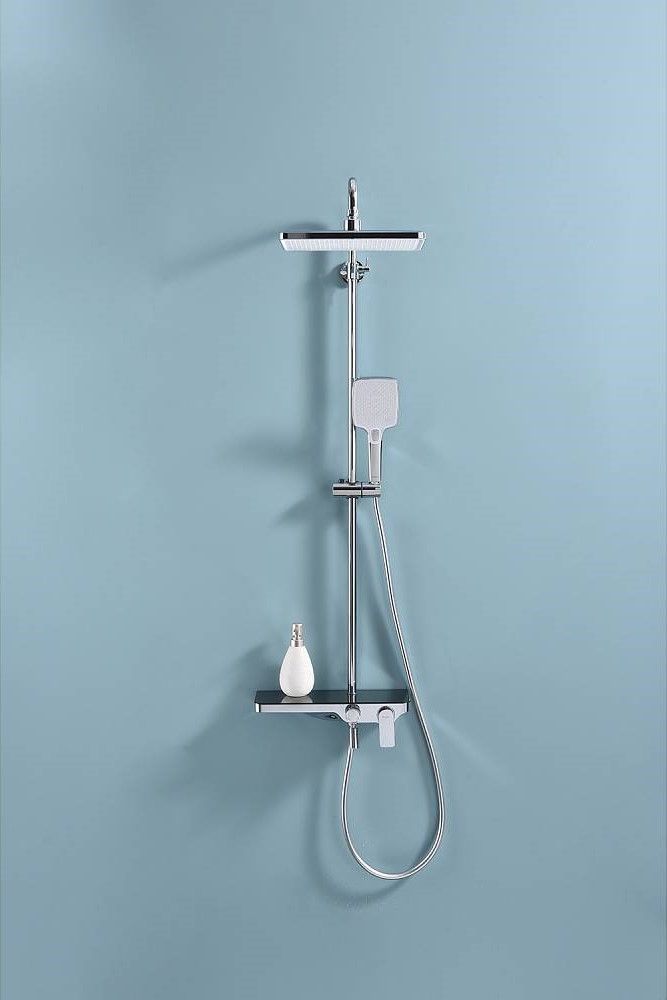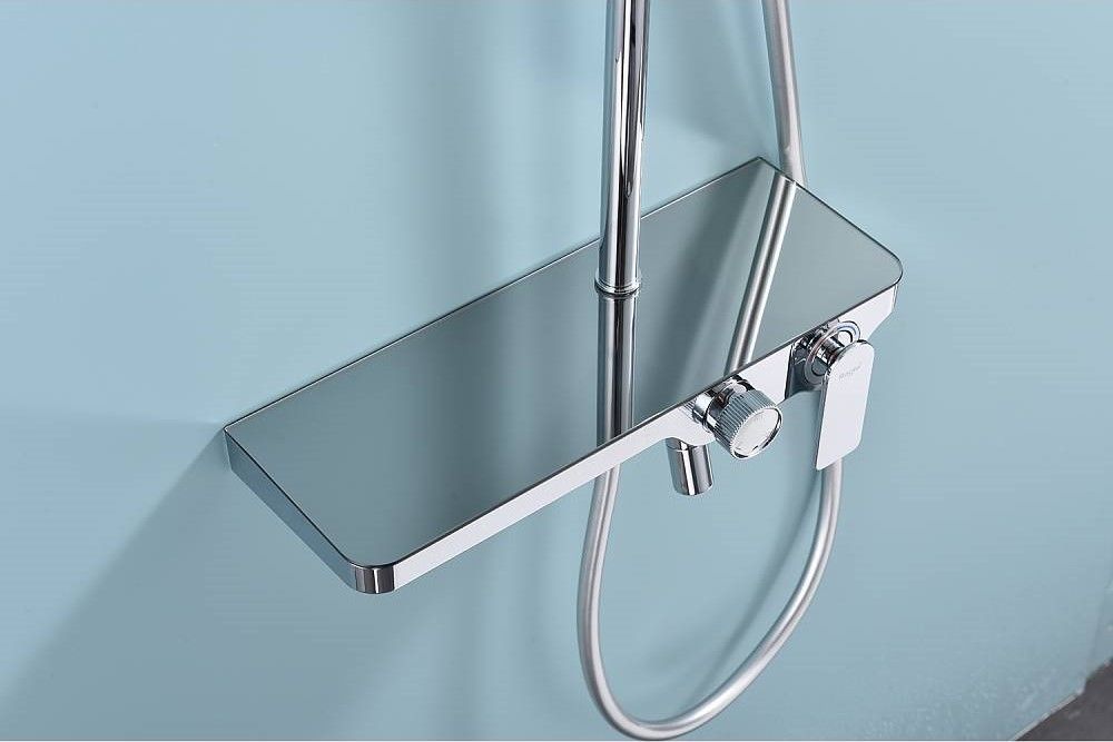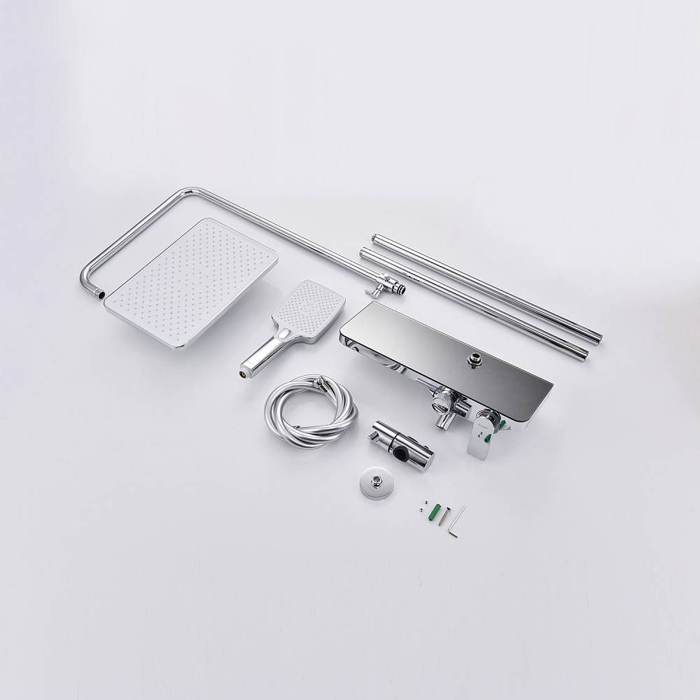Душевая система Raglo R60.24.Материал: латунь.Управление: однорычажное.Механизм: керамический картридж.Скрытый излив с аэратором.Полка из стекла.Регулируемая по высоте душевая штанга: 1100-1530 мм.Форма верхнего душа: прямоугольная.Размер верхнего душа (ШхД): 300х200 мм.Регулируемый по высоте держатель ручного душа.Количество режимов струи ручного душа: 3.Переключение режимов ручного душа: кнопочное.Отверстия для монтажа: 3.Стандарт подводки: G 1/2.Монтаж: на стену.
