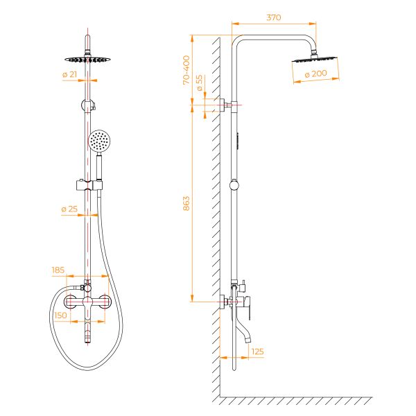 - Головной душ выполнен из нержавеющей стали AISI 304 оснащён со шарнирным креплением, что позволяет выбрать необходимый угол направления воды;