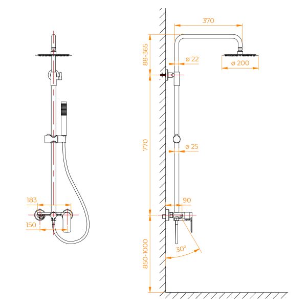 - Стальная штанга с регулировкой высоты головного душа