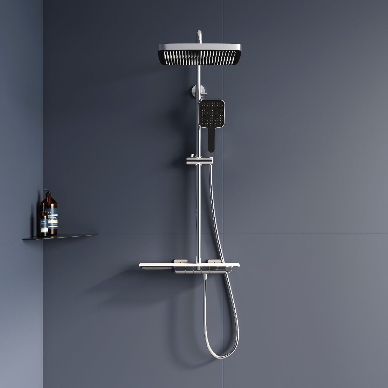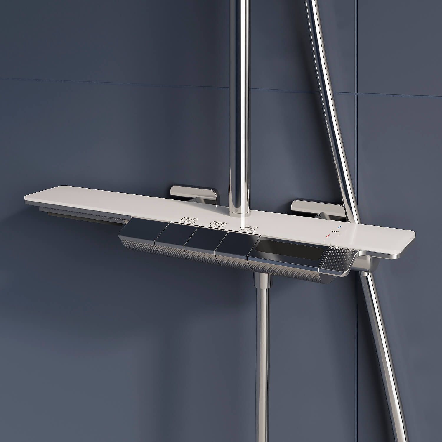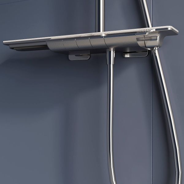 - Вместительная стеклянная полка для душевых принадлежностей;