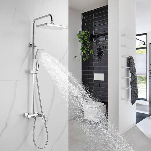 Душевая лейка из ABS пластика с двумя режимами работы также оснащена силиконовыми форсунками, что делает её легкой в уходе. Высота душевой лейки регулируется с помощью держателя на душевой штанге, а телескопическая конструкция штанги позволяет регулировать высоту всей системы, обеспечивая удобство использования для всех членов семьи.