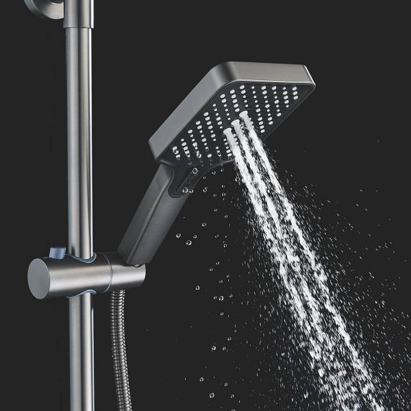 Верхний душ размером 305x205 мм из ABS-пластика регулируется по высоте благодаря телескопической штанге и по наклону с помощью встроенного шарнира, что обеспечивает максимальный комфорт и удобство использования. Самоочищающиеся силиконовые форсунки предотвращают образование известкового налета и сохраняют чистоту и силу потока воды.