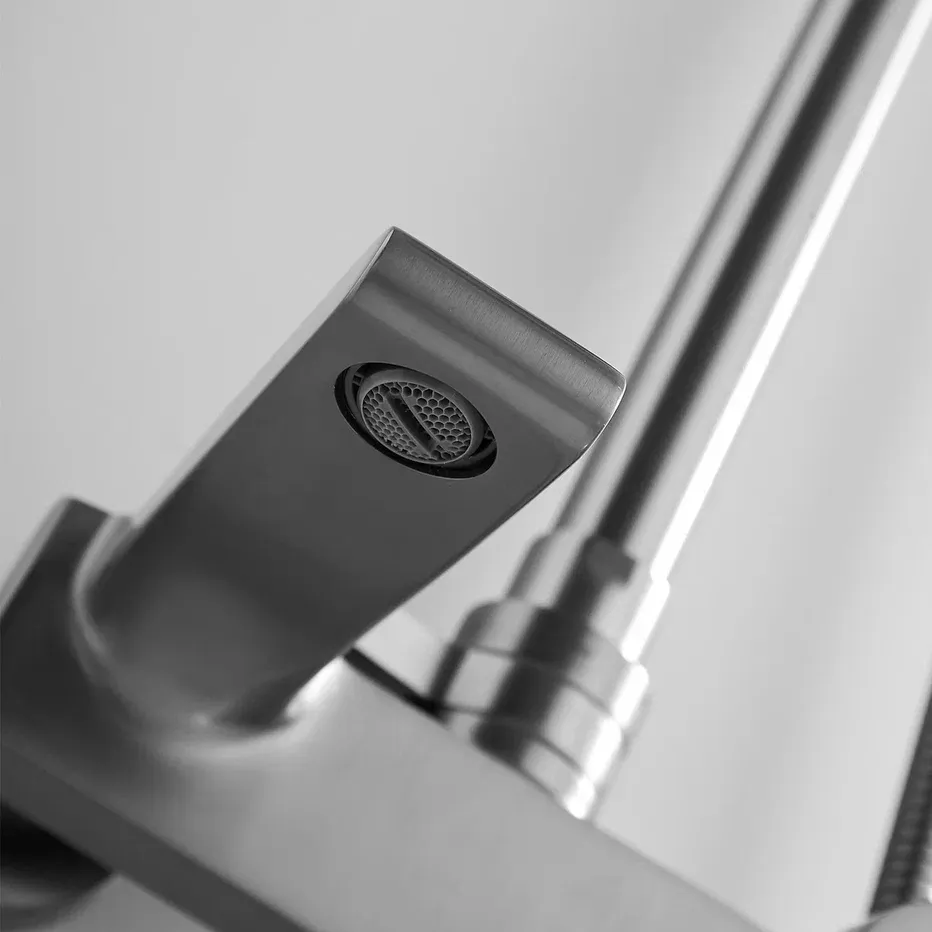 Душевая система Shevanik S8336T, оружейная сталь.Количество режимов струи: 3.Размер верхнего душа: 24,5x24,5 см.Управление: рычажное.Излив для наполнения ванны: да.