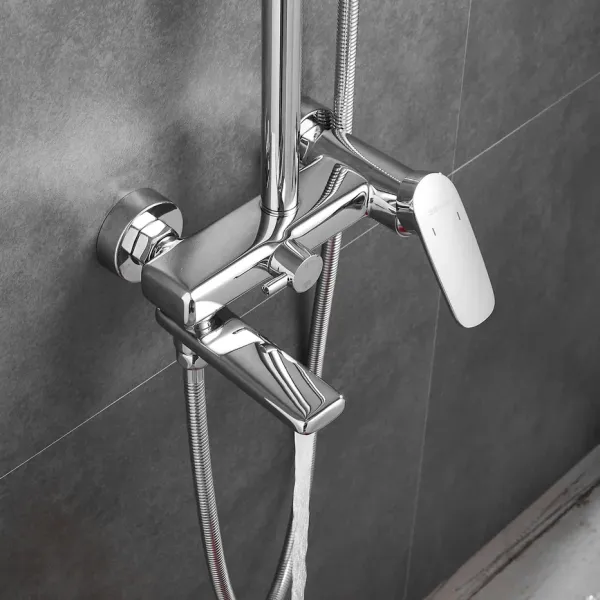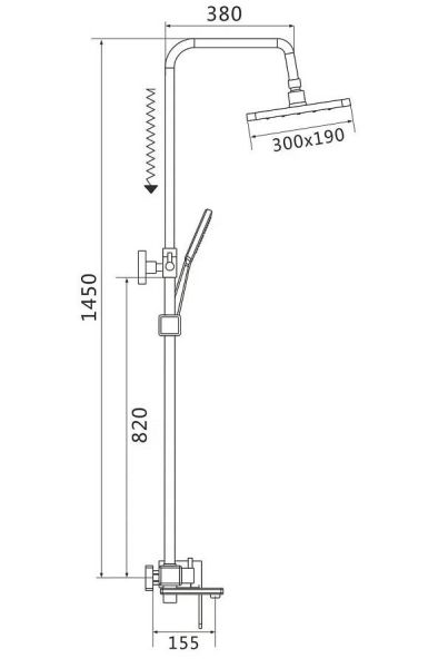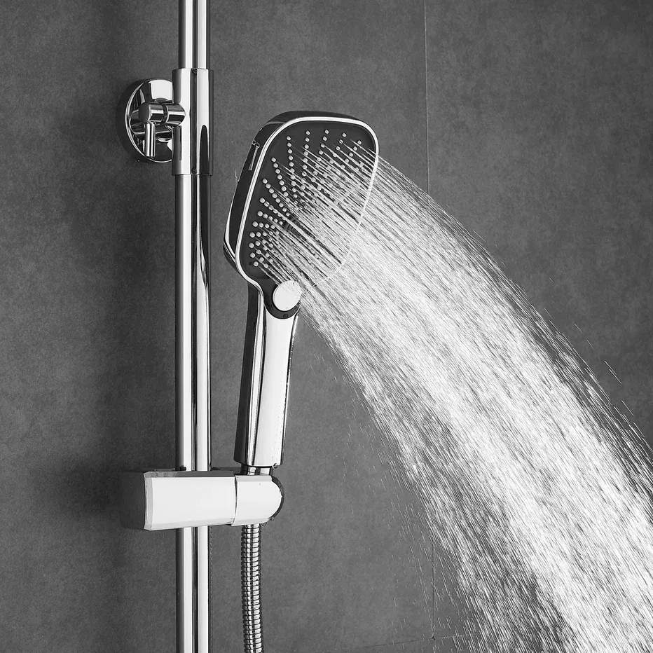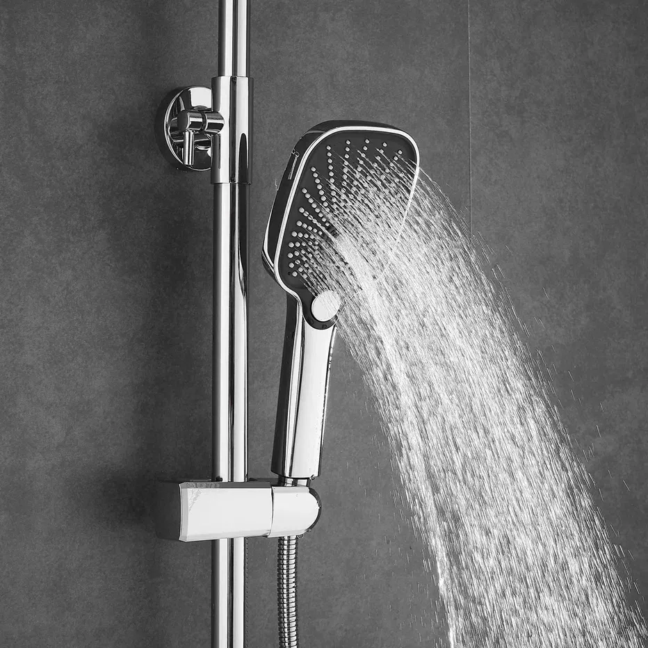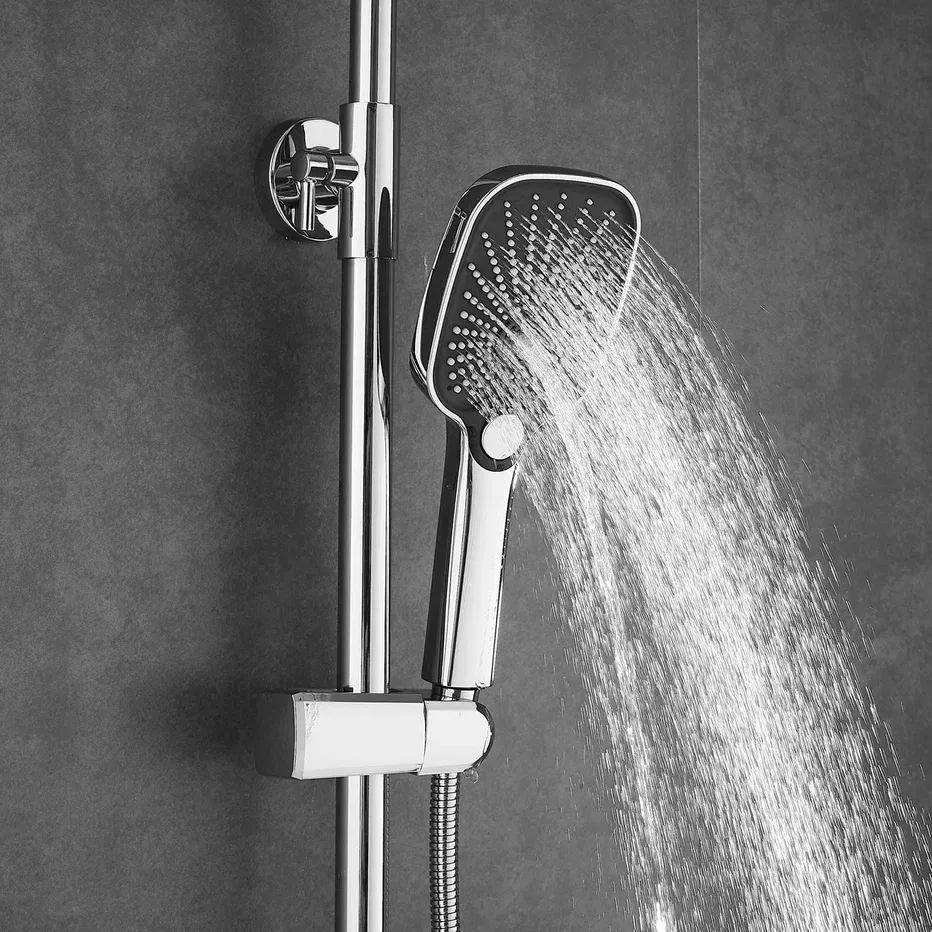 Душевая система Shevanik S8536, хром.Количество режимов струи: 3.Размер верхнего душа: 30x19 см.Управление: рычажное.Излив для наполнения ванны: да.