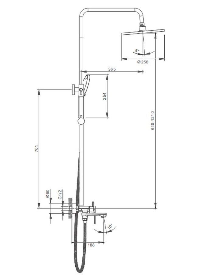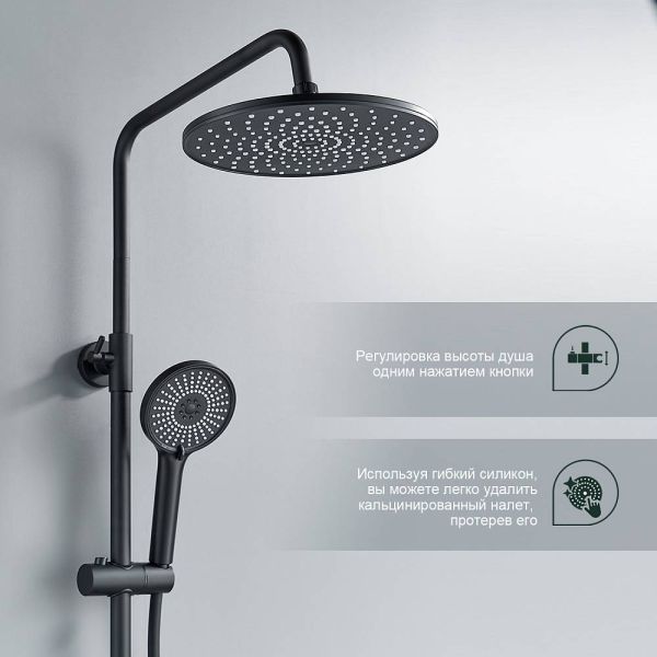 Форма верхнего душа: круглая. Диаметр верхнего душа: 250 мм. Количество режимов струи ручного душа: 3. Регулируемая душевая штанга: 640-1210 мм. Монтаж: на стену.