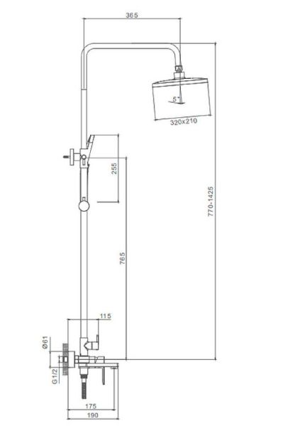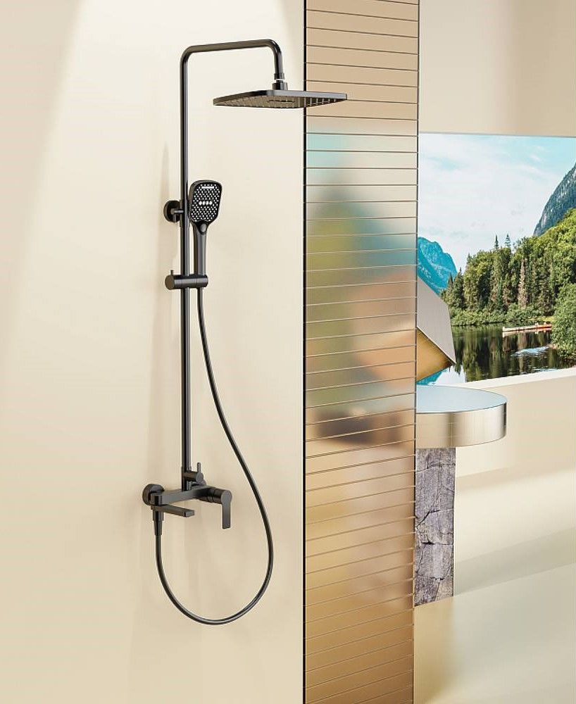 Душевая система Splenka S06.24.06. Цвет: черный. Материал: латунь. Управление: однорычажное. Механизм: керамический картридж. Излив: поворотный. Аэратор. Стандарт подводки: G 1/2. Форма верхнего душа: прямоугольная. Размер верхнего душа (ШхД): 320х210 мм. Количество режимов струи ручного душа: 3. Регулируемая душевая штанга: 770-1425 мм. Монтаж: на стену. Излив - функция переключения.