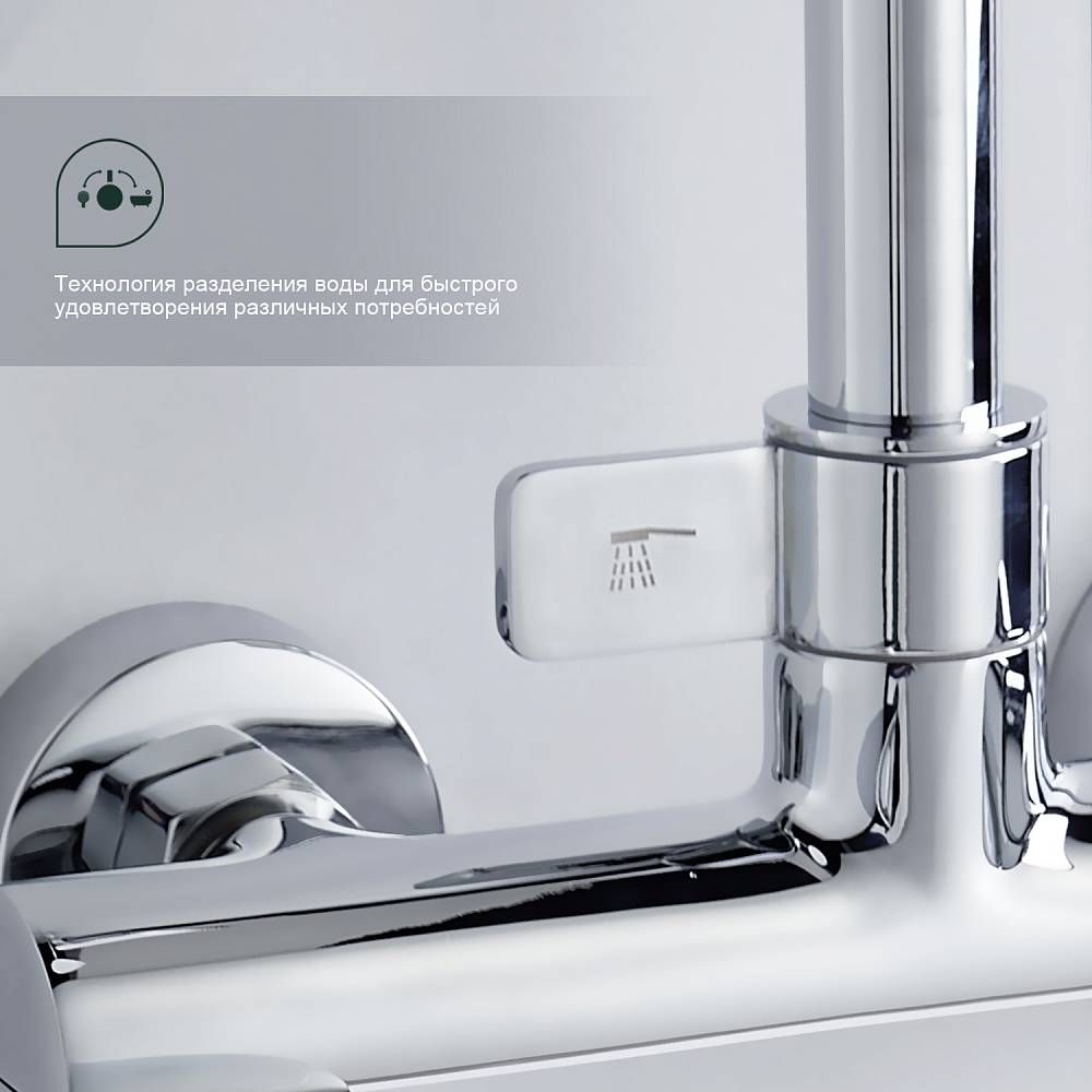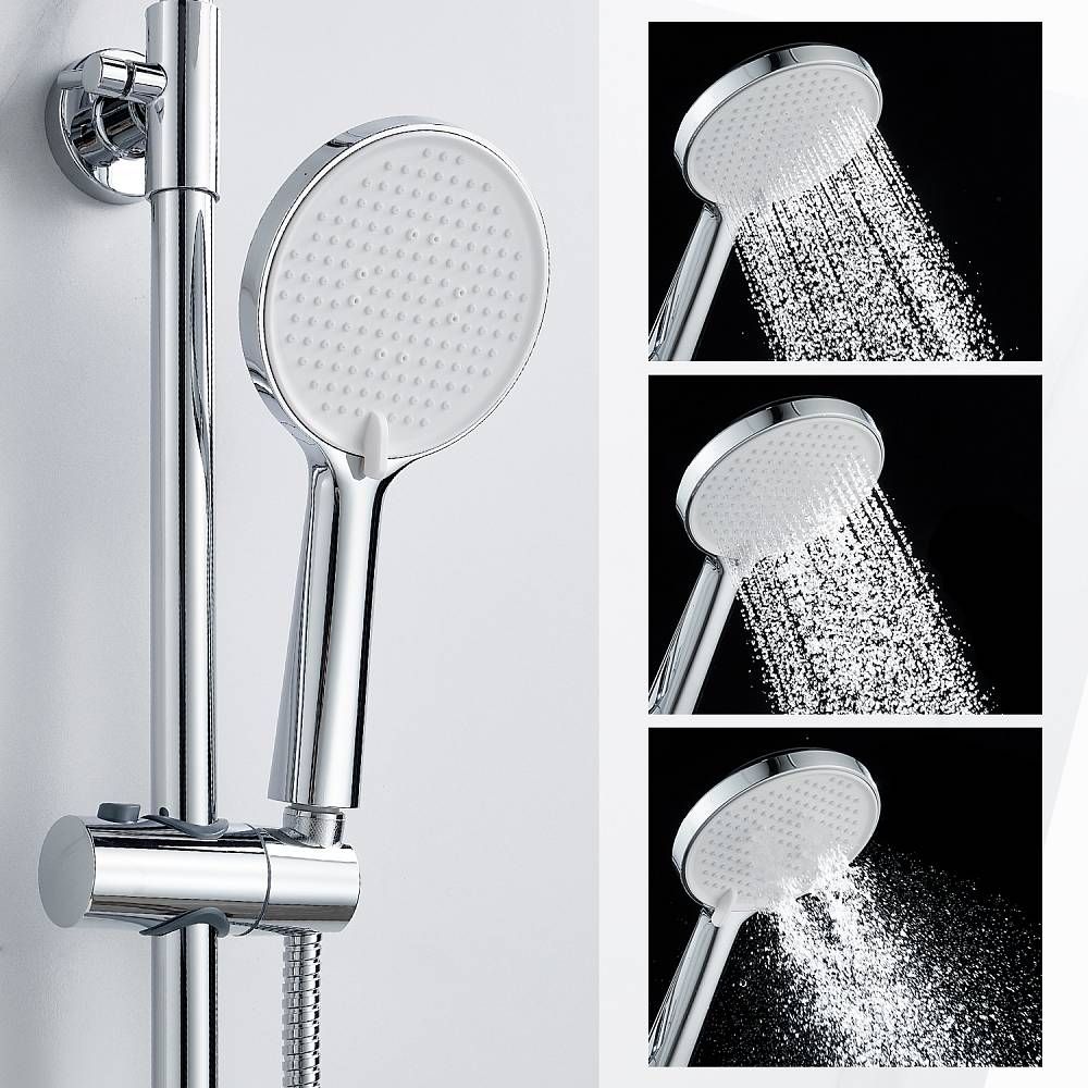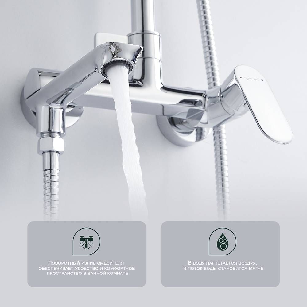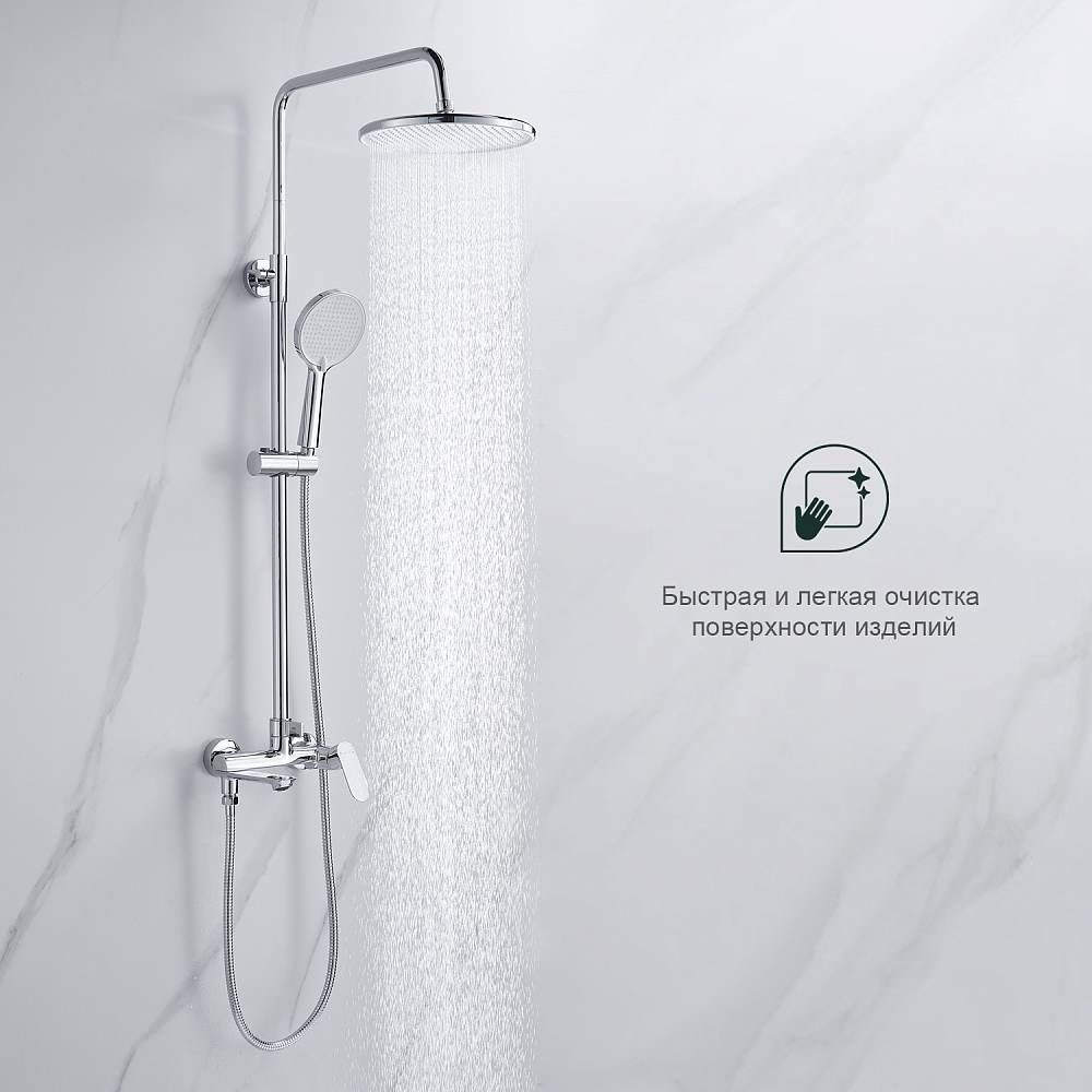 Душевая система Splenka S41.24. Цвет: хром. Материал: латунь. Управление: однорычажное. Механизм: керамический картридж. Излив: поворотный. Аэратор. Стандарт подводки: G 1/2. Форма верхнего душа: круглая. Диаметр верхнего душа: 250 мм. Количество режимов струи ручного душа: 3. Переключение режимов ручного душа: флажковое. Регулируемая по высоте душевая штанга: 950-1350 мм. Регулируемый по высоте держатель ручного душа. Монтаж: на стену. Излив - функция переключения.