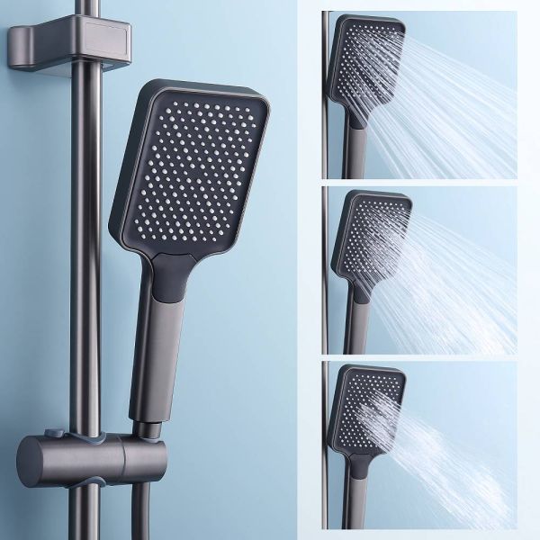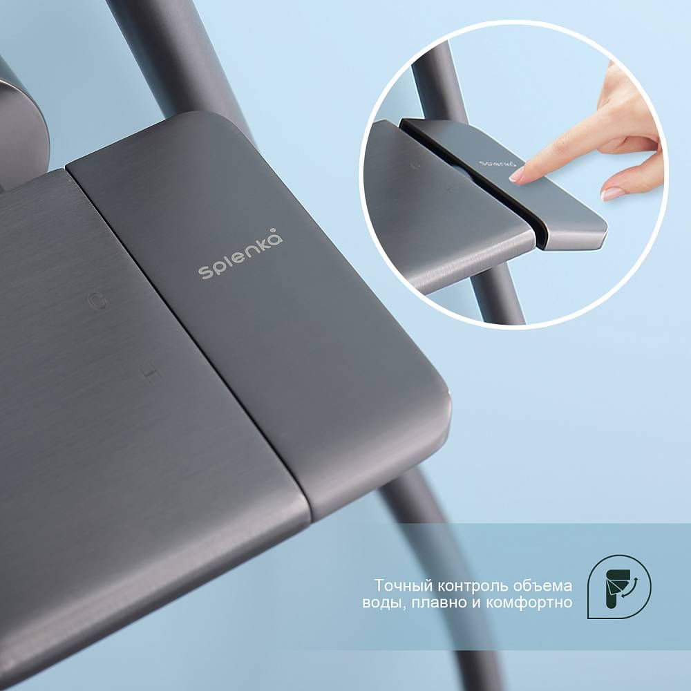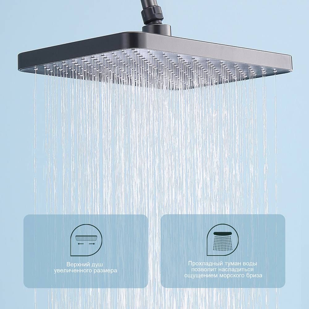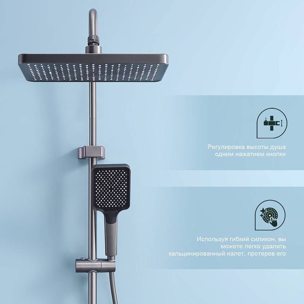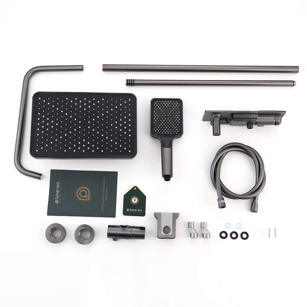 Душевая система Splenka S52.24.09, графит. Душевая система Splenka изготовлена из качественной латуни. Смеситель оснащен аэратором который гарантирует ровный и мягкий поток воды. Душевой комплект упакован в фирменную коробку. Верхний душ - 320*210мм. Душевая лейка - 3 режима.