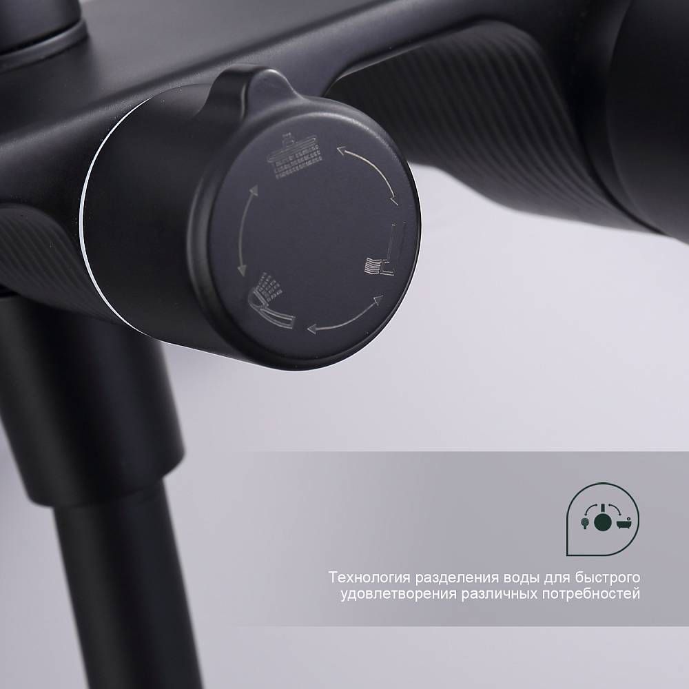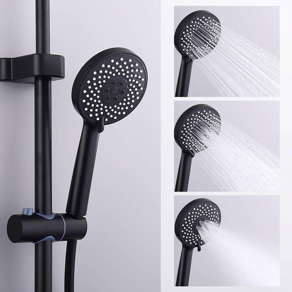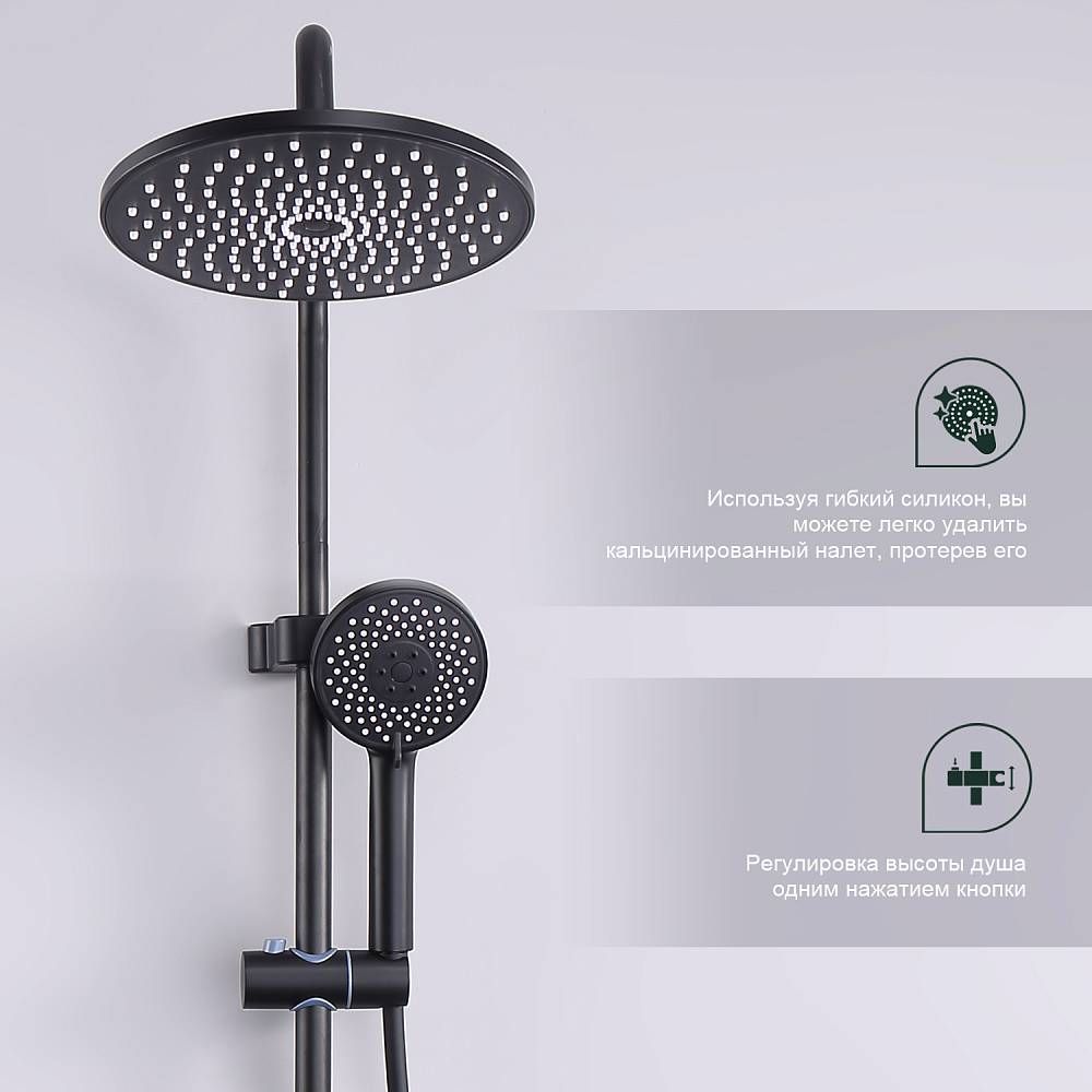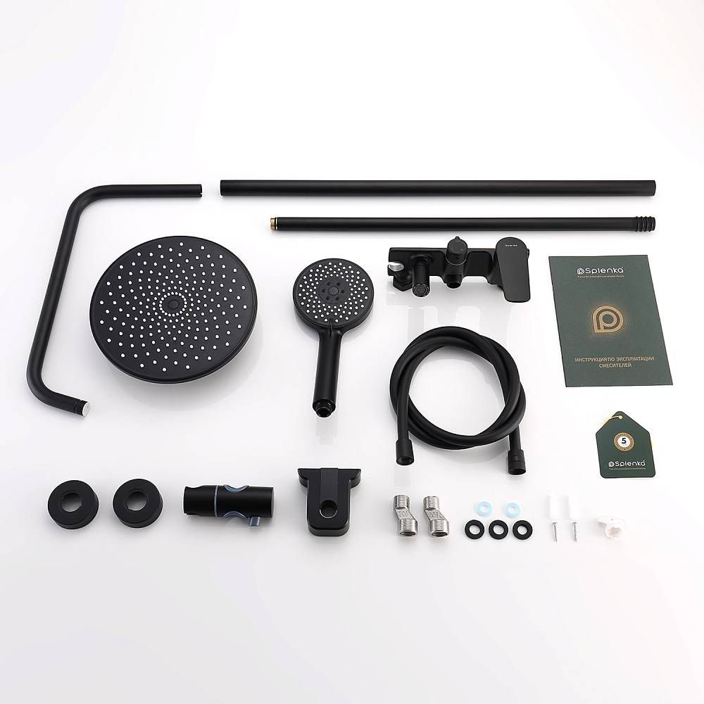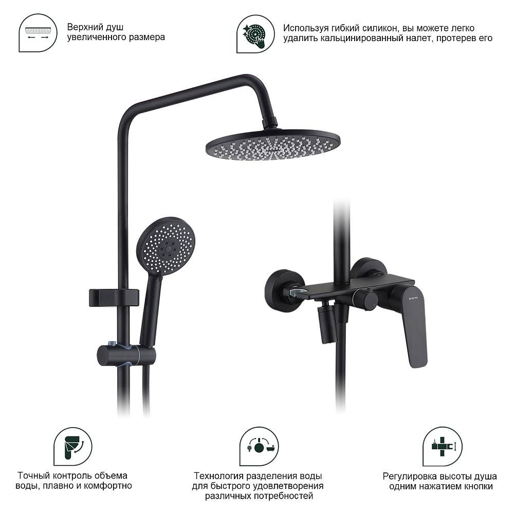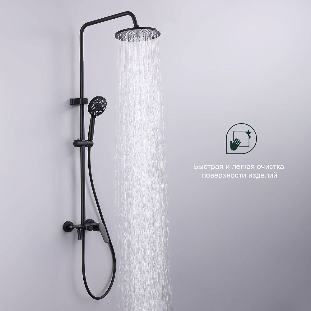 Душевая система Splenka S53.24.06, черный. Душевая система подходит для ванны и душа. Верхний душ имеет круглую форму размером 22 см. Ручная лейка у системы 3-х режимная. Лейки изготовлены из авс-пластика. Изделие выполнено в черном цвете, корпус латунный. Гарантия 5 лет.