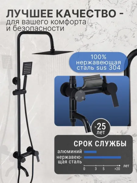 Душевой комплект содержит все необходимое для монтажа. Кроме того, наша душевая стойка черная имеет простой и быстрый монтаж, благодаря чему вы сможете установить ее самостоятельно без привлечения специалистов. Это позволит сэкономить время и деньги, а также получить удовольствие от процесса создания своего уютного уголка в ванной комнате.