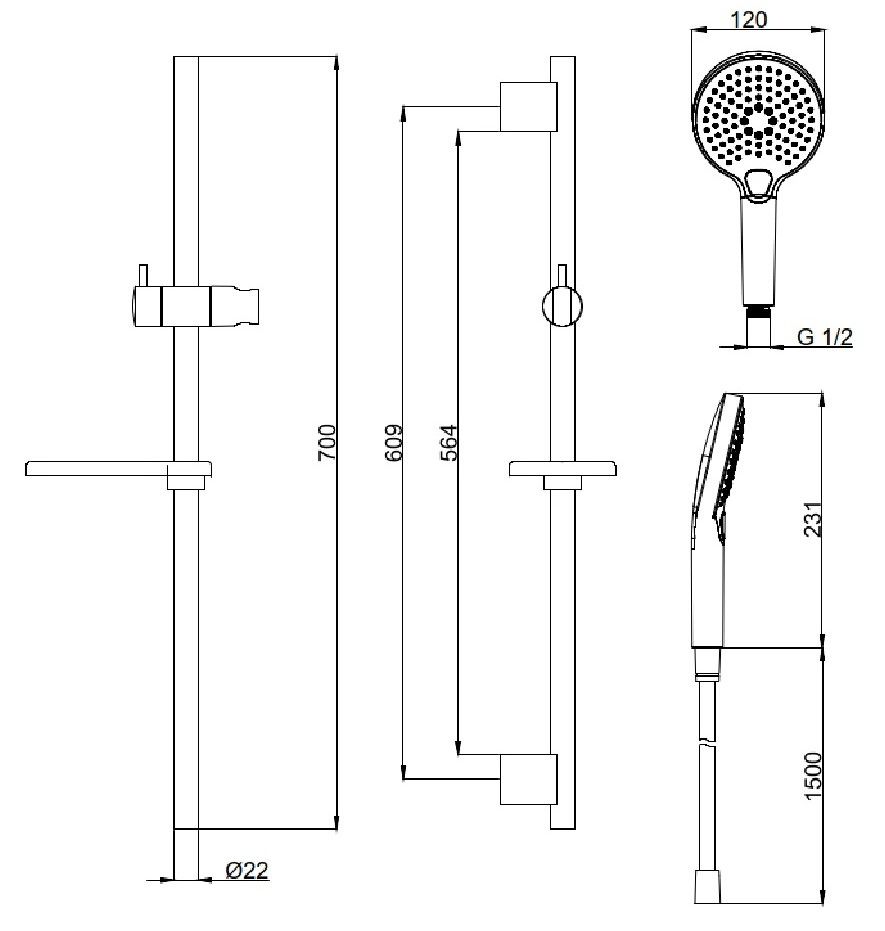 включает в себя: душевая лейка 120 мм, 3 режима струи, душевая штанга 790 мм, душевой шланг 1500 мм 1/2" x 1/2", полочкас системой против известковых отложенийможет использоваться с проточным водонагревателемминимальное давление 1,0 бар