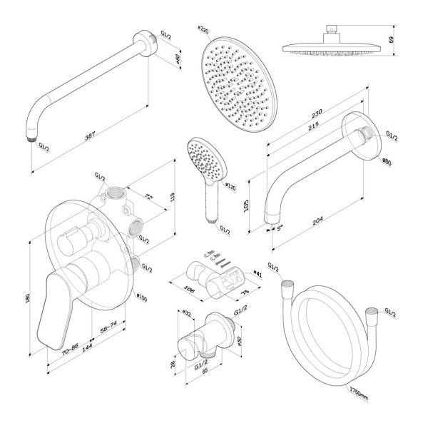 Набор включает в себя: верхний тропический душ 22 см, ручной душ, держатель ручного душа, излив и смеситель.