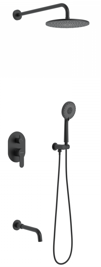 Душевой комплект BERGES NARDIS 3R BLACK - встраиваемый душевой комплект обладает трёхрежимной системой и состоит из верхней лейки - «тропического ливня», ручного душа, излива и смесителя. Лейка верхнего душа имеет инновационную систему самоочистки в виде гибких силиконовых вставок на форсунках душа, которые защищают изделие от известковых отложений. Изготовлены оба душа из ABS пластика. Комплект имеет матовое черное покрытие, которое выглядит безупречно на протяжении всего периода эксплуатации. Шланг выполнен из нержавеющей стали (внутри epdm), смеситель с латунным корпусом имеет керамический картридж с пропускной способностью 28 л/мин, все держатели и кронштейны сделаны из латуни и нержавеющей стали.Скрытый монтаж комплекта позволяет создавать красивое и эргономичное внутреннее пространство всего помещения.